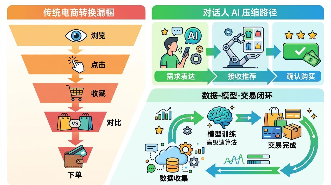 这场跃迁的核心,是用户决策路径的极度压缩。传统电商的转化漏斗,要经过“浏览-点击-收藏-对比-下单”至少5个环节,而对话式AI直接把它拧成了“需求表达-接收推荐-确认购买”3步。招商证券的研报把这种模式总结为「数据-模型-交易」闭环:AI从对话里抓准你的需求意图,用模型匹配最适合的商品,交易完成后的数据再反过来训练模型,让下一次推荐更精准。