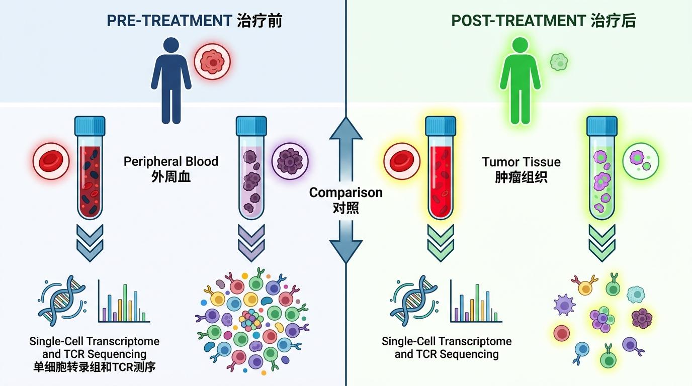 团队给患者做了「配对采样」:治疗前的外周血、治疗前的肿瘤组织,治疗后的对应样本一一对应,再用单细胞转录组和TCR测序把每个细胞的基因表达拆解得明明白白。这种「前后对照、内外对照」的方法,把个体差异的干扰降到了最低。
