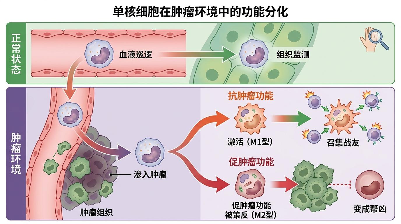 浙江大学王凯教授和刘坚研究员的团队没有走常规路:他们不找单一的基因标记,而是盯着一群叫「单核细胞」的免疫细胞。你可以把单核细胞想象成免疫系统的「侦察兵兼包工头」——平时在血液里巡逻,一旦发现肿瘤信号,就会钻进肿瘤组织,分化成不同功能的细胞,要么召集战友攻击肿瘤,要么被肿瘤策反变成「帮凶」。