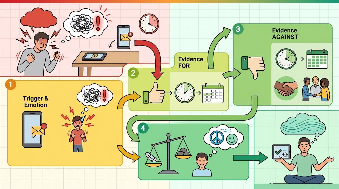 完美主义者并非注定要困在愤怒里,打破循环的核心是把“情绪”和“事实”分开。认知行为疗法(CBT)中的“思维记录”技术,就是帮他们跳出情绪推理的有效工具:每次愤怒时,记录下“触发事件”“我的情绪”“我当时的想法”“支持想法的证据”“反对想法的证据”,最后写下“更客观的结论”。比如伴侣没回消息,记录后可能会发现,“他之前也有过忙到忘回的时候”“他平时对我很上心”,从而推翻“他不在乎我”的极端判断。