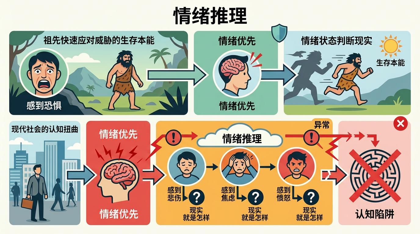 情绪推理,是指个体完全依据自身情绪状态判断现实,而非客观证据的认知扭曲——简单说就是“我感觉怎样,现实就是怎样”。这一概念由认知心理学奠基人艾伦·贝克提出,原本是人类祖先快速应对威胁的生存本能:感到恐惧就认定有危险,能帮原始人第一时间逃跑。但在复杂的现代社会,这种“情绪优先”的机制常常演化为认知陷阱。