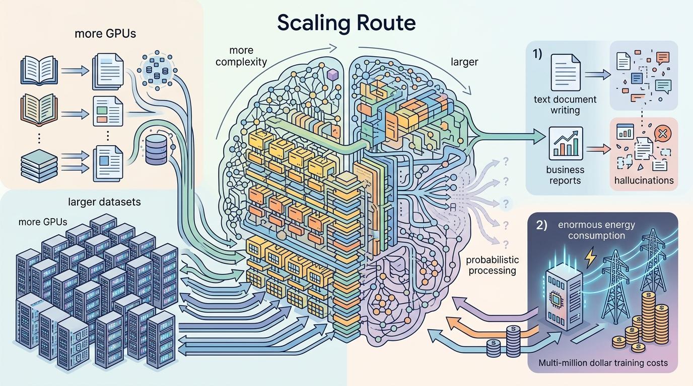 行业主流选择的是「规模路线」:用更多的GPU、更大的数据集、更复杂的Transformer架构,把模型堆得越来越大。就像把图书馆里的书全塞进一个大脑里,让它靠概率猜答案。这种路线的好处是见效快,能快速满足「写文案、做报表」的刚需,但缺陷也很明显:模型会「编瞎话」,无法形成真正的推理能力,而且成本高得惊人——训练一次GPT-4的成本超过千万美元,只有巨头玩得起。