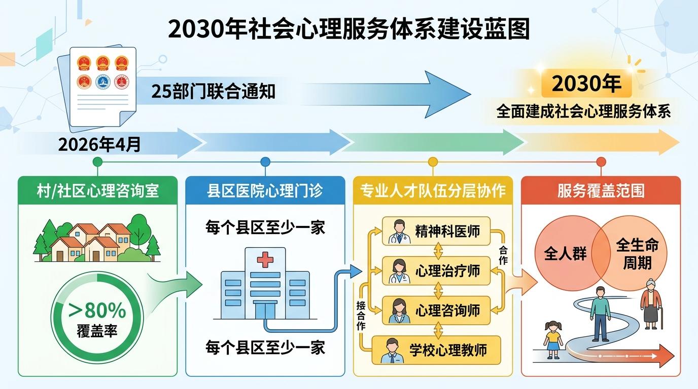 2026年4月的那份25部门联合通知,本质上是给心理学专业搭了一张全新的“就业地图”——不再是零散的心理咨询室,而是要建一个覆盖全人群、全生命周期的社会心理服务体系:到2030年,80%以上的村和社区要有心理咨询室,每个县区至少有一家医院开心理门诊,精神科医师、心理治疗师、心理咨询师、学校心理教师要形成分层协作的队伍。