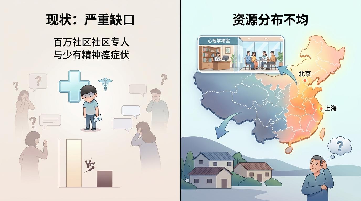 但逆袭不是一蹴而就的。目前全国精神科医师只有2万多人,按照规划,仅基层社区就需要至少10万名专业心理服务人员,缺口肉眼可见。更棘手的是资源不均:一线城市的心理咨询工作室已经开到了商场里,而西部农村的村民可能连“心理咨询”是什么都没听过。