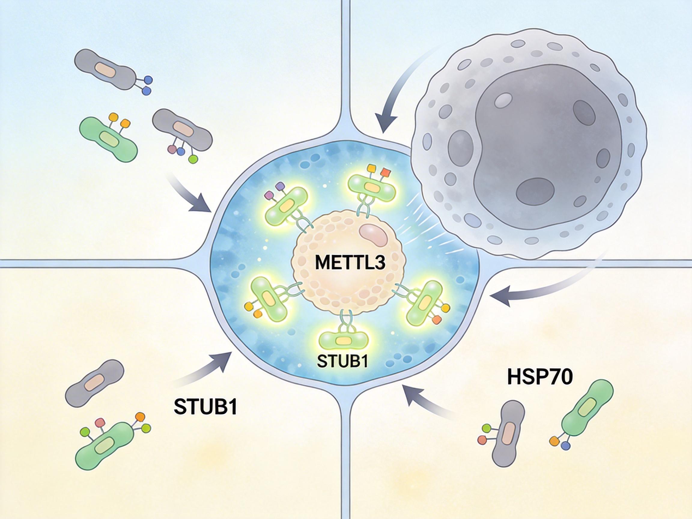酒精是怎么拆碎METTL3的? 答案是找了个“帮凶”——E3泛素连接酶STUB1。酒精会激活这个酶,给METTL3贴上“降解标签”,同时还破坏了热休克蛋白HSP70对METTL3的保护。原本HSP70像个保镖一样把METTL3护在怀里,酒精一来,保镖被赶跑,METTL3就只能等着被细胞的“垃圾处理站”碾碎。