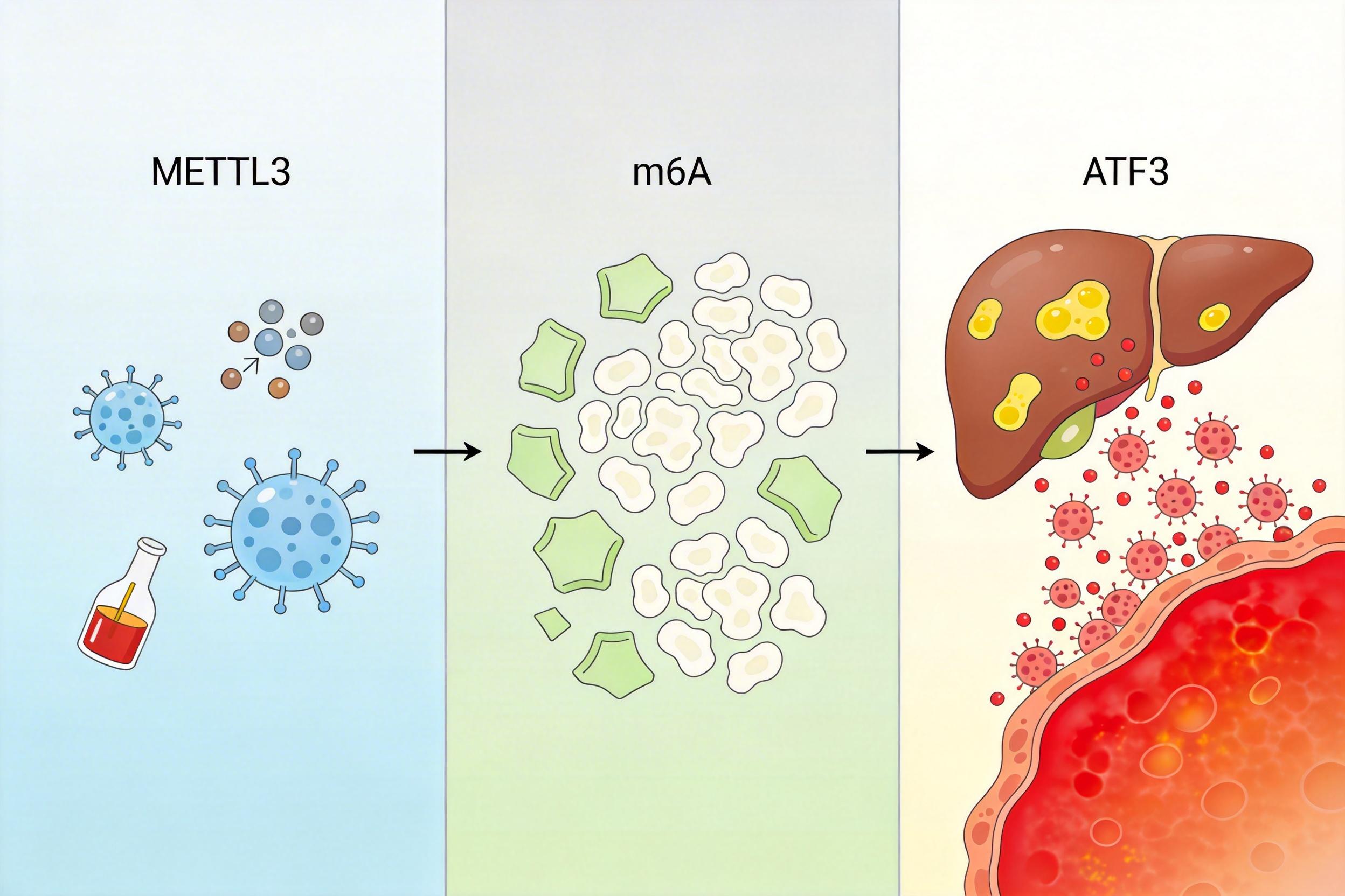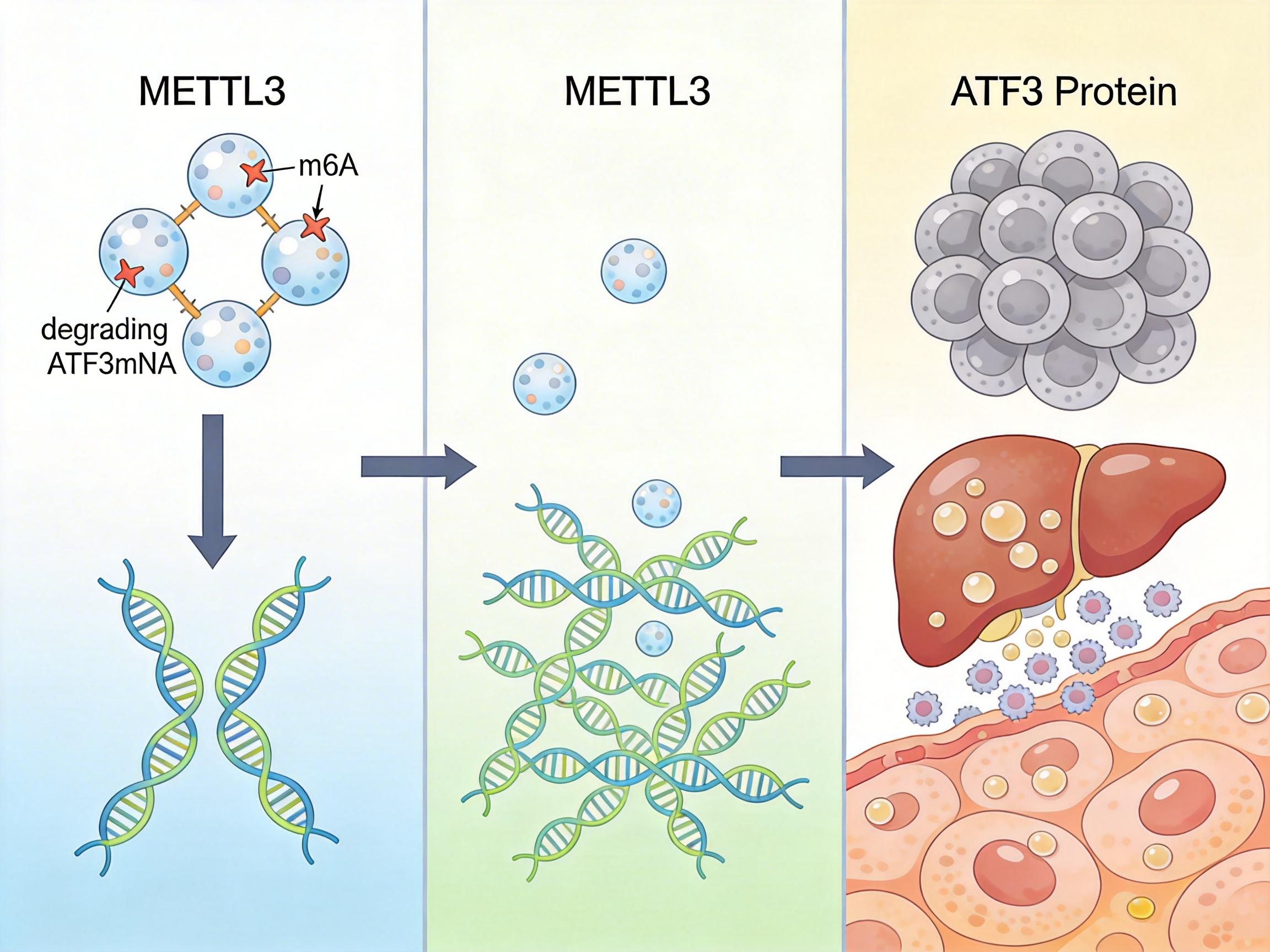 你可以把METTL3想象成细胞里的“印章师”——它负责给mRNA盖上一个叫m6A的化学印章,这个印章决定了mRNA的“命运”:是被快速翻译出蛋白质,还是被降解清除。正常情况下,这个印章系统维持着肝脏的代谢平衡和免疫稳定。