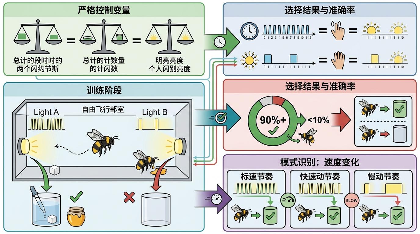 为了排除熊蜂耍小聪明的可能,实验设计得近乎苛刻:两种闪烁节奏的总时长、闪烁次数完全平衡,连单次闪烁的亮度都被严格控制,杜绝任何局部线索的干扰。训练时,只有对应特定节奏的灯光会带来糖水奖励,熊蜂要在自由飞行中自己摸索规律。结果是,它们不仅能以90%以上的准确率选对节奏,就算把节奏速度加快一倍或放慢一半,依然能稳稳认出目标模式。