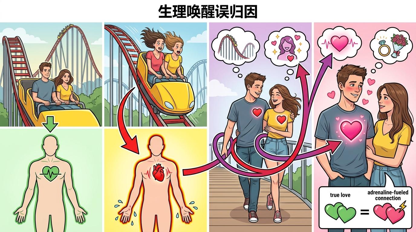 你有没有过这种体验:在过山车顶端,身边刚好坐着一个好看的人,下来的时候突然觉得“好像有点喜欢TA”?这就是**生理唤醒误归因(misattribution of arousal)**——当你的心跳加速、手心出汗时,大脑会自动找一个最近的“理由”来解释,而身边的人,往往就是那个“背锅侠”。