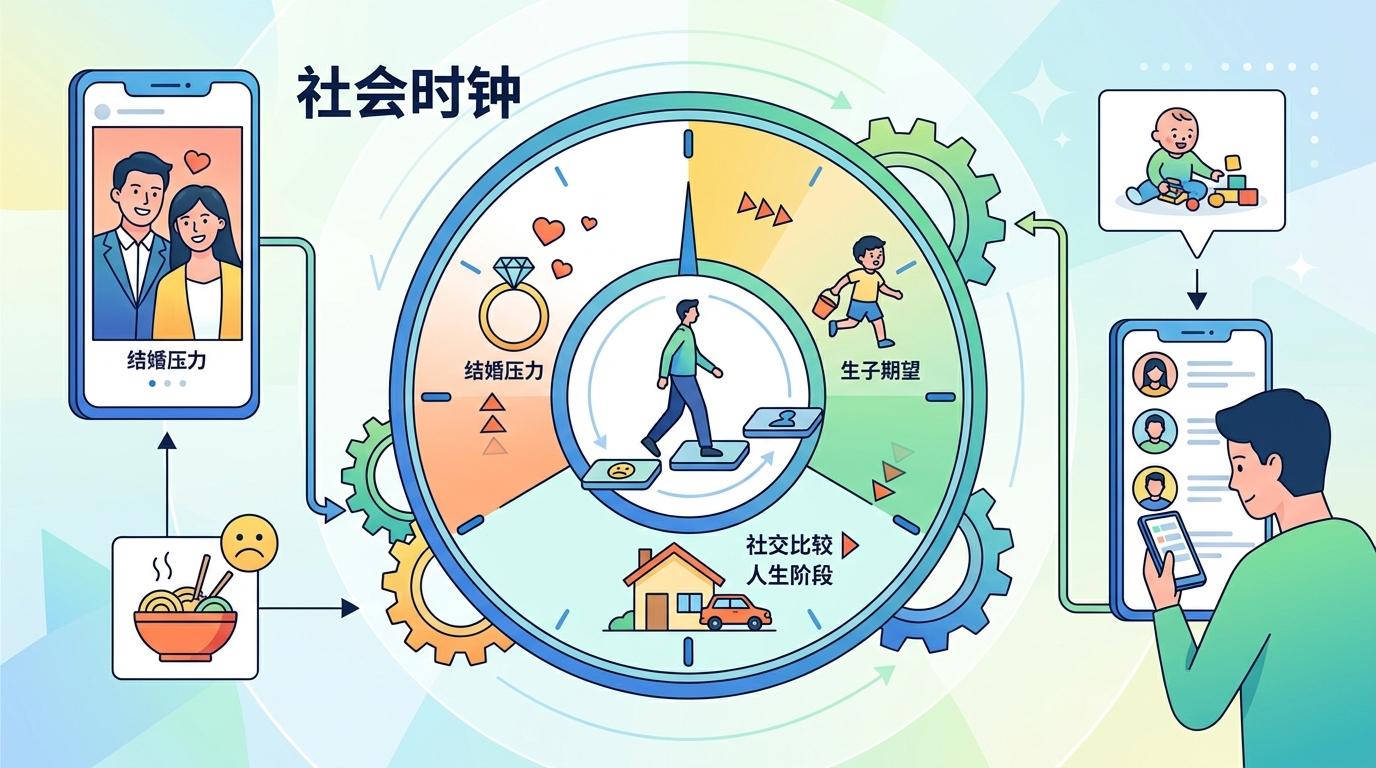你有没有过这种时刻:刷到朋友的结婚照,突然觉得手里的外卖不香了;妈妈一句“你王阿姨的孙子都会打酱油了”,让你对着手机里的相亲列表发呆?这就是社会时钟(social clock)——一种文化给你画的人生时间表,什么时候结婚、什么时候生子,都有默认的“截止日期”。
