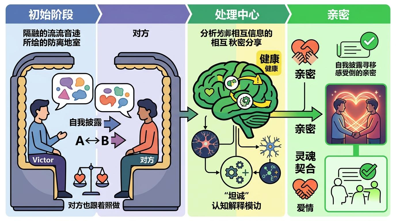 《Love Is Blind》的隔音舱,就是这个实验的放大版。嘉宾Victor在婚礼上说:“你比地球上任何人都懂我。”不是因为他们真的灵魂契合,是**深度自我披露**的机制在起作用——当你把自己最脆弱的部分摊开,对方也跟着照做时,大脑会自动把这种“坦诚”翻译成“亲密”。