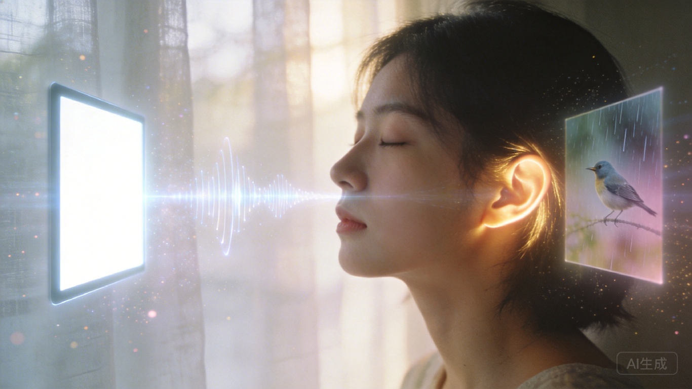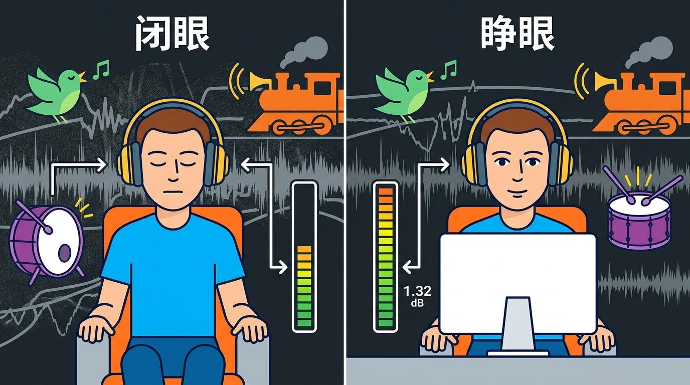 他们让参与者戴着耳机,在背景噪声里辨别鸟叫、火车鸣笛、鼓声这些声音,同时设置了四种视觉条件:闭眼、看空白屏幕、看和声音相关的照片、看匹配的视频。结果完全反直觉:闭眼时任务最难,哪怕只是睁着眼看空白屏幕,参与者能辨别的声音平均比闭眼时轻1.32分贝——差不多是把手机音量再调低一格的差距。
