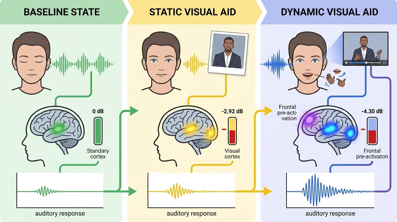 而视觉信息就像给大脑装了个「信号定位器」。看相关照片时,参与者能听见比闭眼时轻2.92分贝的声音;看匹配的视频时,这个数值是4.30分贝。动态的视觉线索甚至能提前「预激活」听觉皮层,让大脑在声音出现前就做好准备,精准捕捉信号的节奏和细节。