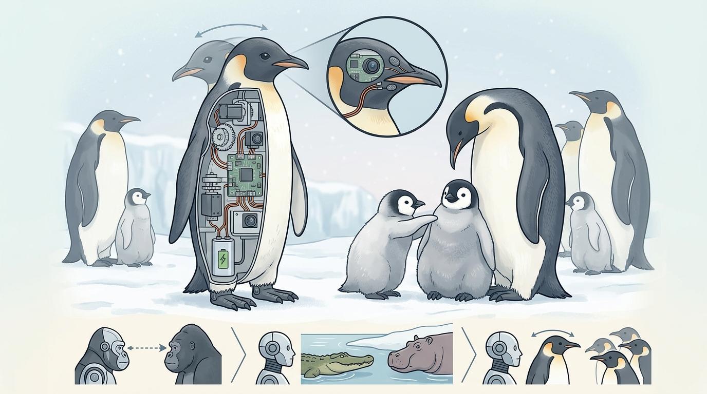 BBC的《荒野间谍》已经用五十余种仿生机器人证明了这种可能性:伪装成企鹅的机器人能混进种群,记录下幼崽挤在一起取暖的细节;模仿鳄鱼的机器人能潜伏在河岸,拍到河马泡澡时的放松状态。这些机器人靠的不只是逼真的外形,更有对动物行为细节的精准复刻——比如大猩猩机器人会避开同类的直视,企鹅机器人会轻轻晃动脑袋。它们能做到人类做不到的事:以“同类”的身份,进入动物的社交圈。
