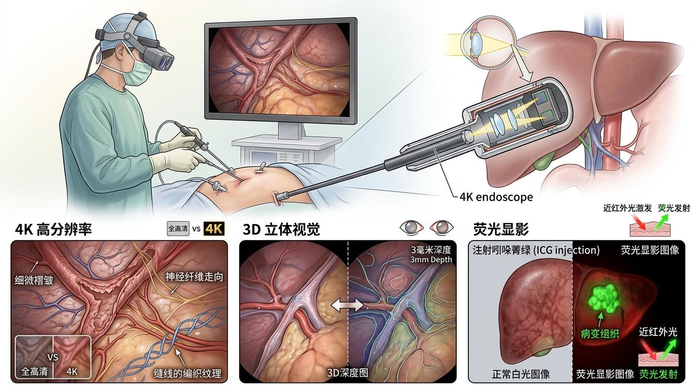 当外科医生握着细长的内窥镜探入患者体内,他们面对的从来不是简单的“看”——是要在毫米级的缝隙里找到肿瘤边界,在缠绕的血管中避开致命误触,在模糊的组织纹理里分辨健康与病变。过去,这像在暗室里穿针引线,全靠经验和运气。直到一套把4K高清、3D立体、荧光显影拧成一股的系统出现,才把暗室的灯彻底点亮,让手术的“精准度”从模糊的概念,变成了可以量化的毫米、毫秒和像素。