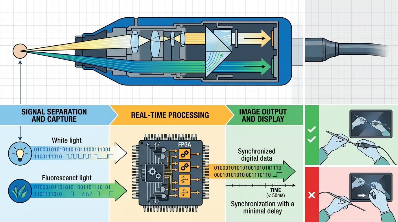 但真实的技术比这个类比更精密:为了让三个模式同时工作不打架,工程师在有限的镜身里塞进了双光路系统,用光学棱镜把白光和荧光信号分开捕获,再通过FPGA芯片实时处理——这个芯片能并行运算30多种算法,把图像延迟压到50毫秒以内,保证医生的手动到哪,眼睛看到的画面就跟到哪,不会出现“手已经动了,画面还没跟上”的脱节。