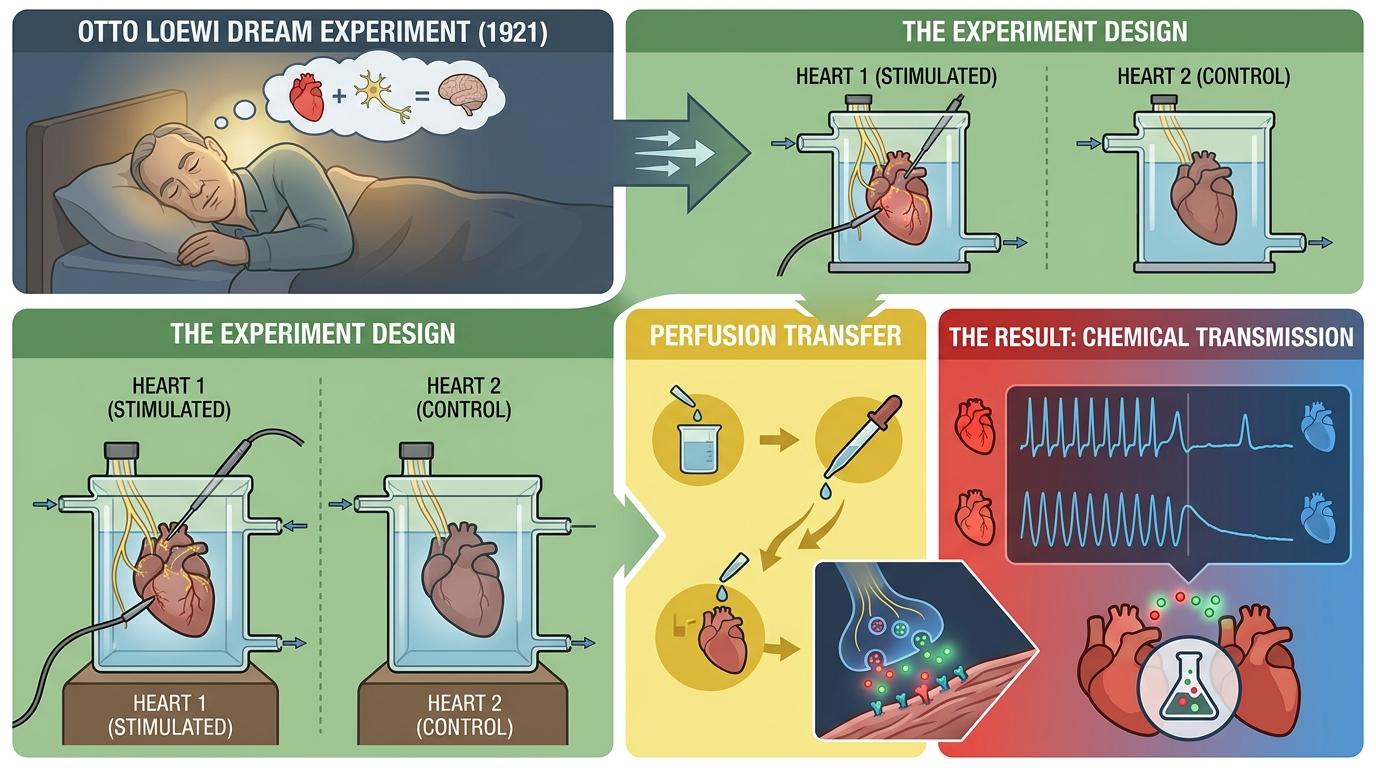 20世纪初,科学界正为“神经信号是电还是化学”争论不休。1921年复活节前夜,德国科学家奥托·洛伊在梦中得到一个实验构思:把刺激过迷走神经的青蛙心脏灌流液,注入另一颗未受刺激的青蛙心脏。当第二颗心脏也随之减慢跳动时,他知道神经信号是靠化学物质传递的,他称之为“迷走物质”。