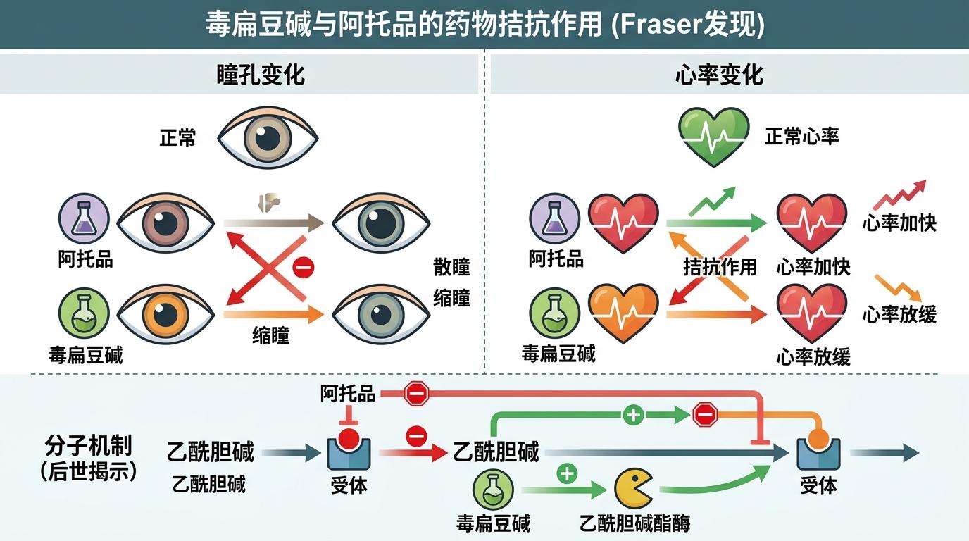 弗雷泽很快发现了一个关键规律:毒扁豆碱能精准抵消阿托品的作用——阿托品散大瞳孔,它就让瞳孔收缩;阿托品加快心率,它就让心率放缓。这是药理学史上首次明确的药物拮抗关系,而毒扁豆碱的核心机制,要等到半个世纪后才被揭开。