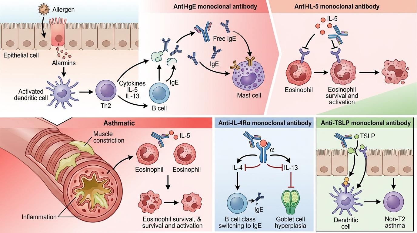 过去治疗重度哮喘,就像用消防水管乱喷——激素能浇灭大部分火苗,但也会烧坏正常的「建筑」,比如导致骨质疏松、血糖紊乱。而生物制剂的出现,相当于给医生递上了带瞄准镜的「定向导弹」。 目前针对T2高炎症(也就是嗜酸性粒细胞主导的哮喘)的生物制剂,已经形成了完整的「打击链条」:抗IgE单抗能提前掐断过敏原触发的炎症信号,抗IL-5单抗能直接销毁嗜酸性粒细胞的「弹药库」,抗IL-4Rα单抗则能同时阻断IL-4和IL-13两条炎症通路,连「纵火犯」的后勤补给都给断了。更厉害的是抗TSLP单抗,它能直接在气道上皮层「拆警报器」,从源头阻止错误的炎症信号被触发,连非T2型哮喘患者都能获益。