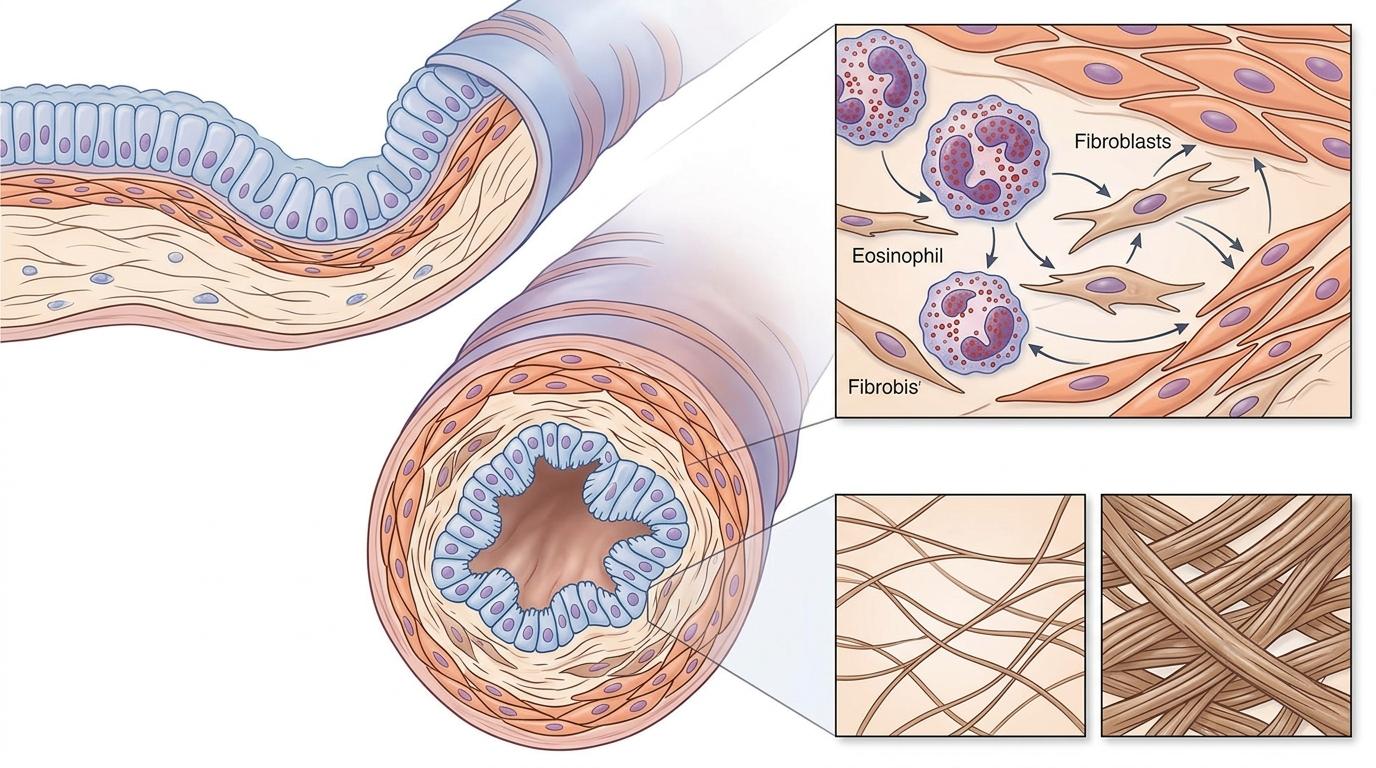 更麻烦的是,嗜酸性粒细胞还会和气道平滑肌、成纤维细胞形成「炎症联盟」,一点点把柔软的气道壁硬化成「钢筋水泥」——这就是不可逆的气道重塑,也是重度哮喘患者肺功能越来越差的根本原因。
