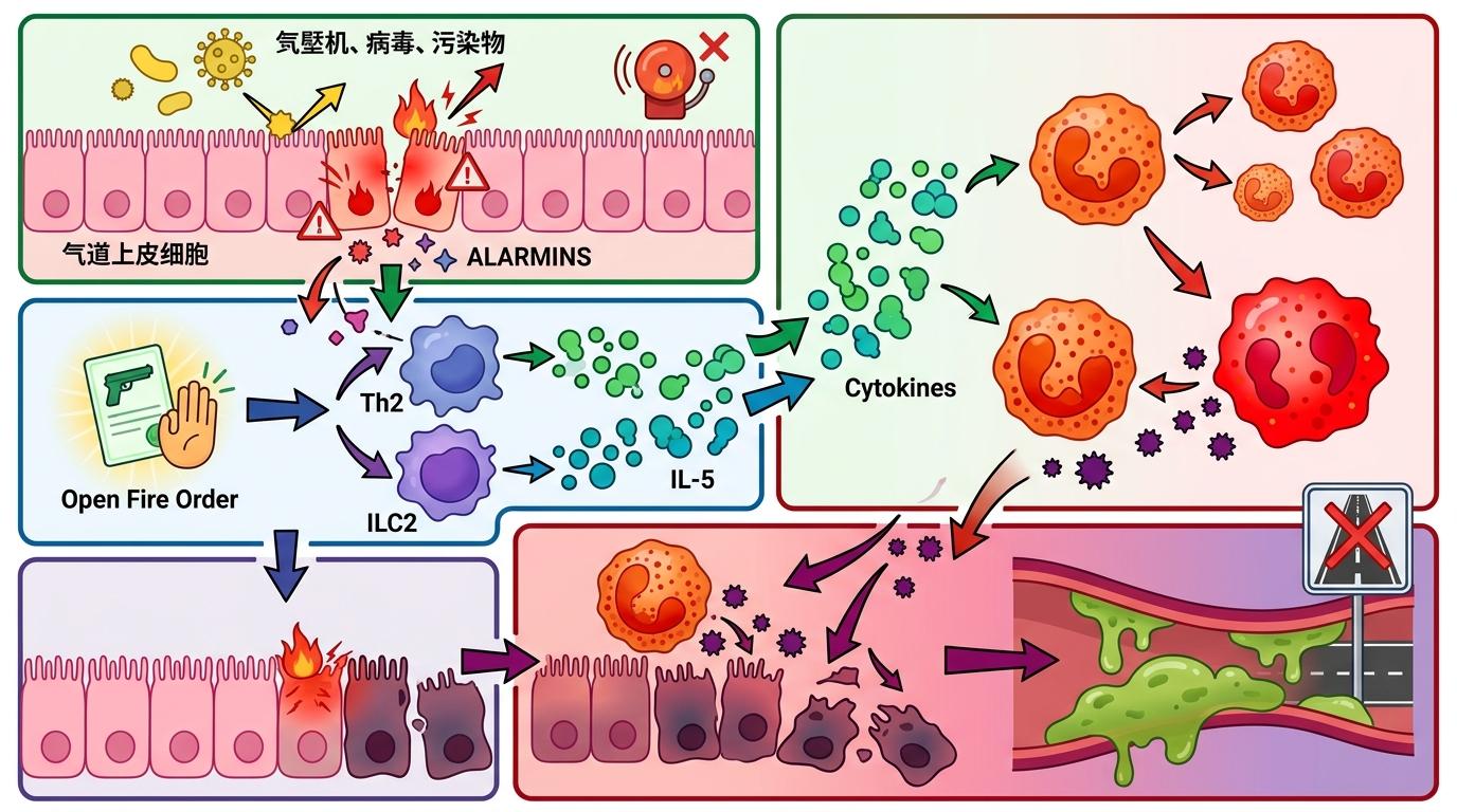 你可以把气道炎症想象成一场失控的火灾,而嗜酸性粒细胞(EOS)就是最顽固的纵火犯。这种看起来不起眼的白细胞,平时是身体对付寄生虫的「特种兵」,但在哮喘患者体内,它会被异常激活的免疫信号「策反」—— 当气道上皮细胞被过敏原、病毒或污染物刺激,会释放IL-33、TSLP等「警报素」,像拉响了错误的火警。Th2细胞和ILC2免疫细胞接到信号后,会大量分泌IL-5,这相当于给嗜酸性粒细胞发了「无限开火权」:它们在气道里疯狂增殖、活化,释放出毒性颗粒蛋白,直接灼伤气道上皮,还会刺激黏液疯狂分泌,把气道堵成黏糊糊的「死胡同」。