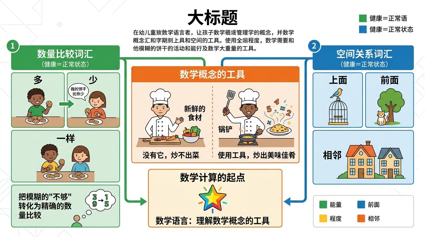 数学语言到底是什么?它分两类:一类是帮孩子做数量比较的词,比如“多”“少”“一样”;另一类是描述空间关系的词,比如“上面”“前面”“相邻”。这些词不是空洞的词汇,而是孩子理解数学概念的工具——就像厨师的锅铲,没有它,再新鲜的食材也炒不出菜。当孩子说“我的饼干比你少”时,他不是在抱怨,是在练习把模糊的“不够”转化为精确的数量比较,而这正是所有数学计算的起点。