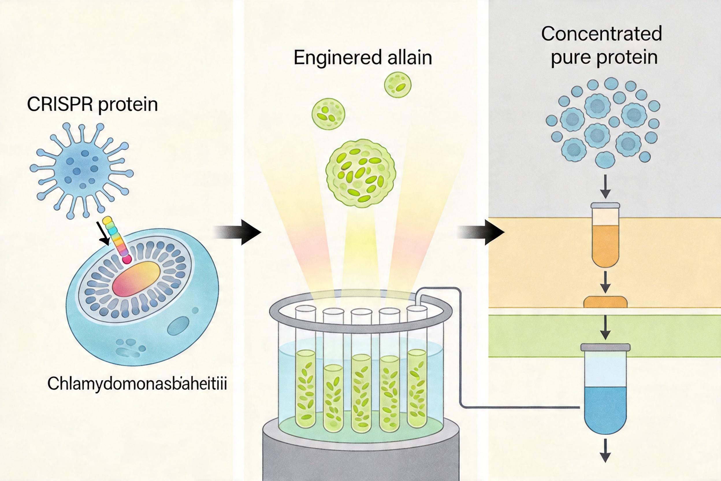 但真实的机制比这个工厂类比更精确:研究人员用CRISPR/Cas9技术把目标基因插入莱茵衣藻的核基因组,再筛选出能稳定遗传、高效表达的工程株。这种藻株在光生物反应器里培养一周,就能收获足够的降糖蛋白,后续的纯化步骤也比细胞培养简单得多。