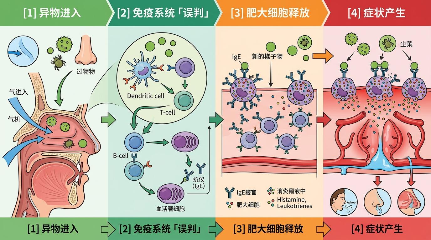 过敏性鼻炎不是「鼻子娇气」,而是免疫系统的一场「误判」——当花粉、尘螨这些本来无害的物质进入鼻腔,免疫系统却把它们当成了「入侵敌人」,立刻启动全套防御:肥大细胞像被点燃的火药桶,释放出组胺、白三烯等炎症介质;血管扩张、黏膜肿胀,鼻塞、流涕、喷嚏这些症状就找上门来。