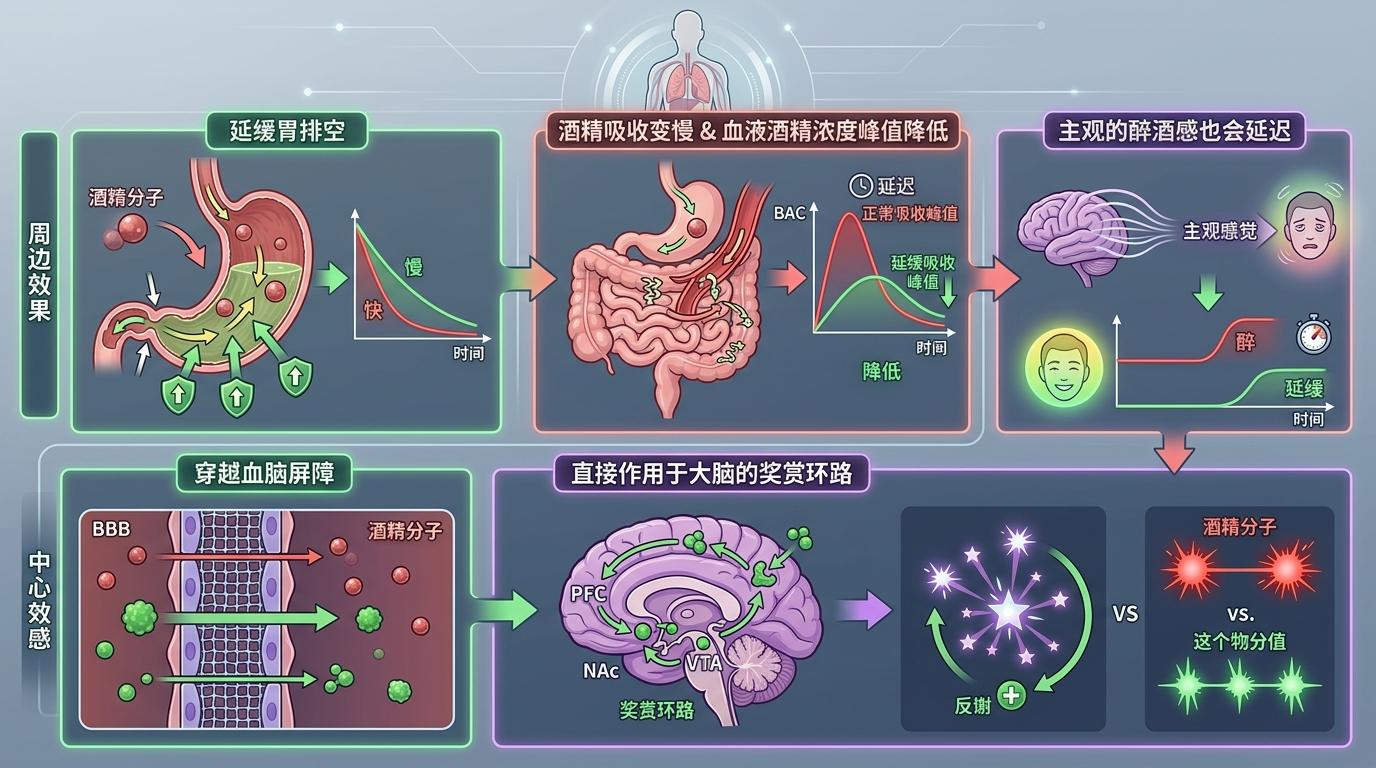 GLP-1受体激动剂最初是用来治疗2型糖尿病和肥胖的——它能延缓胃排空、增加饱腹感,还能调节血糖。但科学家很快发现,它对酒精的抑制作用,是中枢和外周双重机制的结果。 外周层面,它能延缓胃排空,让酒精吸收变慢,血液酒精浓度峰值降低,主观的醉酒感也会延迟。更关键的是中枢层面:它能穿越血脑屏障,直接作用于大脑的奖赏环路。