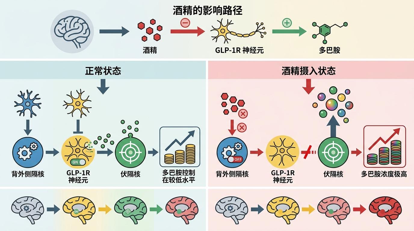 你可以把酒精的奖赏机制想象成一场盗窃:酒精偷偷溜进大脑,按下伏隔核的多巴胺释放按钮——那是大脑的「快乐中枢」,每一次释放都让人产生「喝酒真好」的愉悦感,最终形成难以摆脱的依赖。 但真实的机制比这更精确:中科院深圳先进院的研究团队发现,酒精的第一步破坏,是抑制了背外侧隔核里的GLP-1R神经元。这群神经元就像大脑里的「酒精刹车」,原本会通过局部环路抑制伏隔核的多巴胺释放,可酒精一来,它们就「罢工」了。
