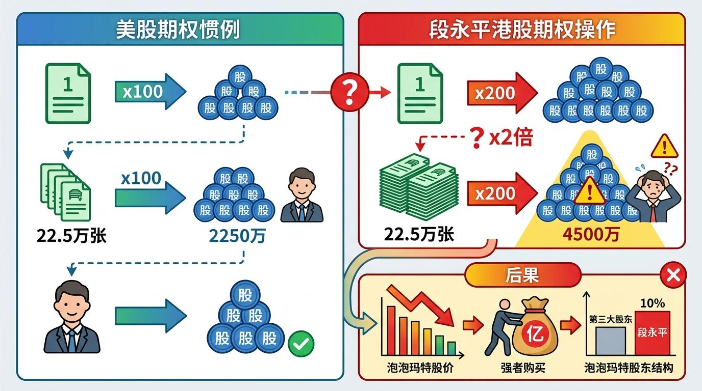 港股和美股的期权合约单位差了一倍:美股1张期权对应100股,而泡泡玛特的港股期权1张对应200股。段永平按美股习惯卖了22.5万张,实际对应的股票数直接翻番,从2250万股变成4500万股。这意味着,只要泡泡玛特股价跌破150港元,他就得拿出近百亿港币接盘,一跃成为第三大股东。
