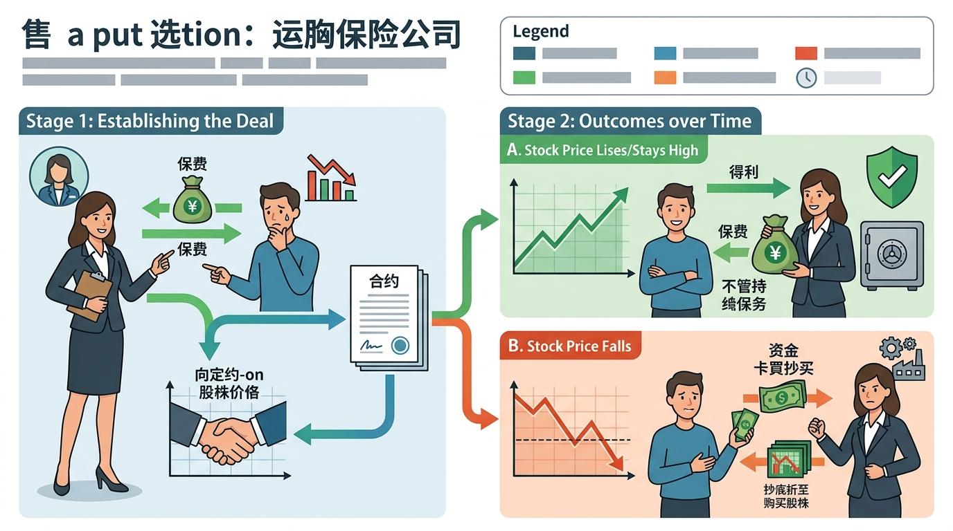 段永平所说的“开保险公司”,其实是价值投资圈里的经典策略——卖出看跌期权(sell put)。用最通俗的话解释:你开了家“股价保险公司”,有人担心某只股票会跌,就给你交一笔“保费”(权利金);你承诺,如果股票跌到约定价格以下,就按约定价把股票买下来。要是股价没跌,这笔保费就归你,不用掏一分钱买股票;要是真跌了,你就用之前谈好的价格接盘,相当于用“打折价”抄底。