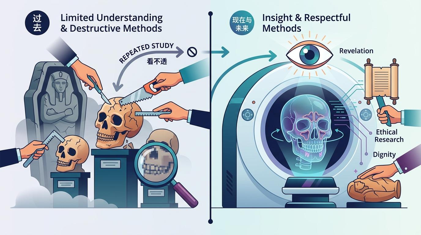 这正是技术带来的另一种启示:我们对古代遗骸的认知,永远受限于观测工具。过去几十年里,这些标本被反复研究,却始终困在“看不透”的僵局里。如今CT打开的不仅是遗骸的内部,更是一种新的研究伦理——不必再为了获取信息而破坏文物,不必再让千年遗骸在解剖刀下失去最后的尊严。