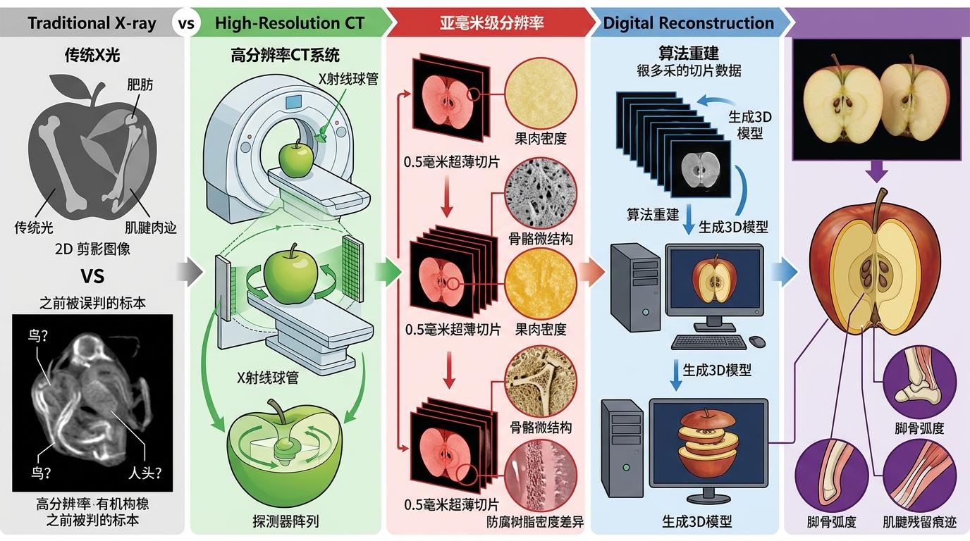 高分辨率CT的原理说穿了很简单——就像把苹果切成几千片薄到0.5毫米的果片,每一片都用X射线拍张高清照,再用算法拼回一个完整的3D苹果。和传统X光的“平面剪影”不同,它能区分骨骼微结构、绷带的层叠纹理甚至防腐树脂的密度差异,分辨率精准到亚毫米级。之前被误判为鸟或人头的标本,就是在这种“分层透视”下,露出了脚骨的弧度和肌腱的残留痕迹。