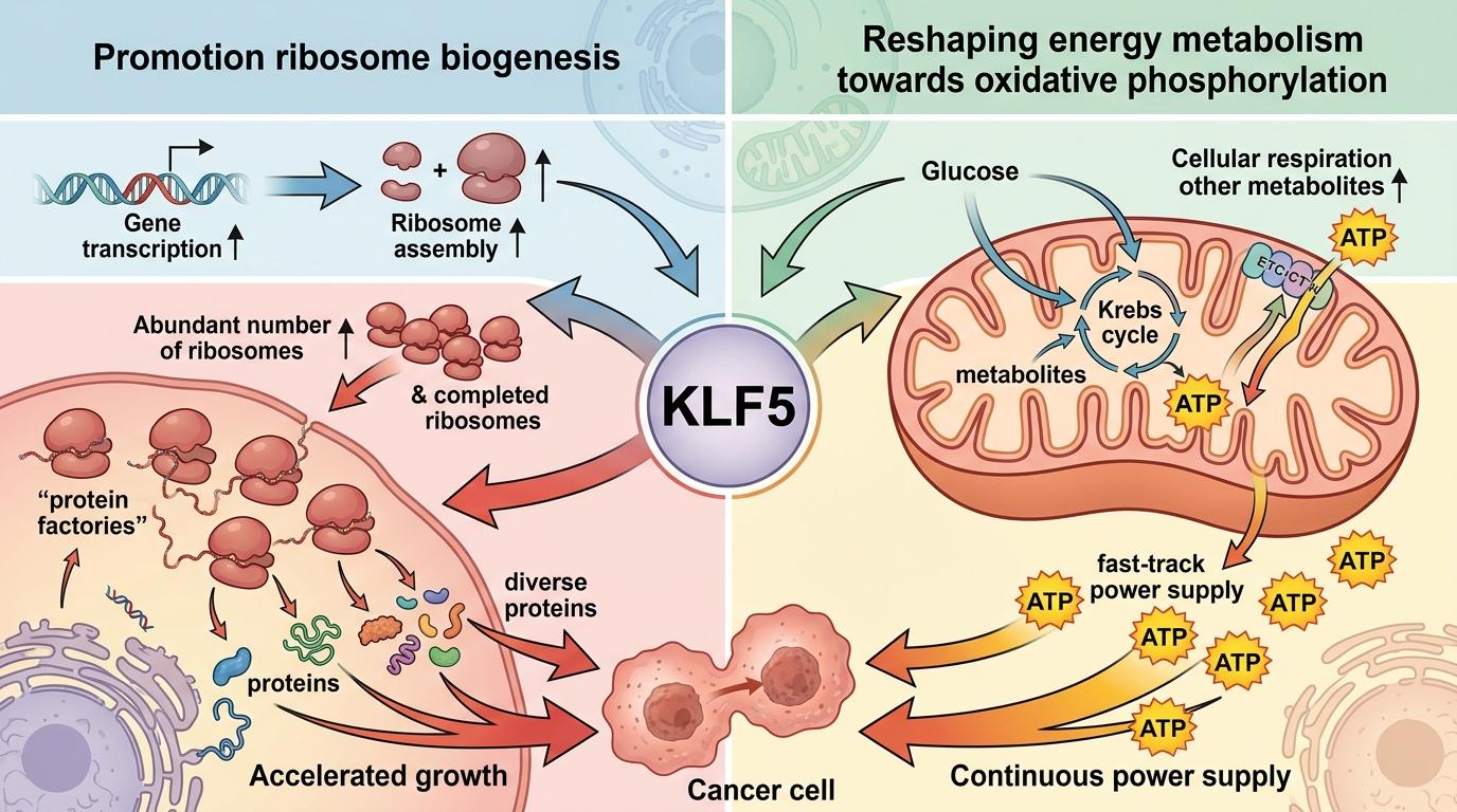 这个过程里,KLF5干了两件最关键的事:一是疯狂推动核糖体生物合成,就像给癌细胞开了无数个「蛋白质工厂」,让它们能快速合成增殖所需的各种蛋白质;二是重塑能量代谢,把细胞的能量供应切换到氧化磷酸化的高速通道,给癌细胞的疯狂生长源源不断地供能。