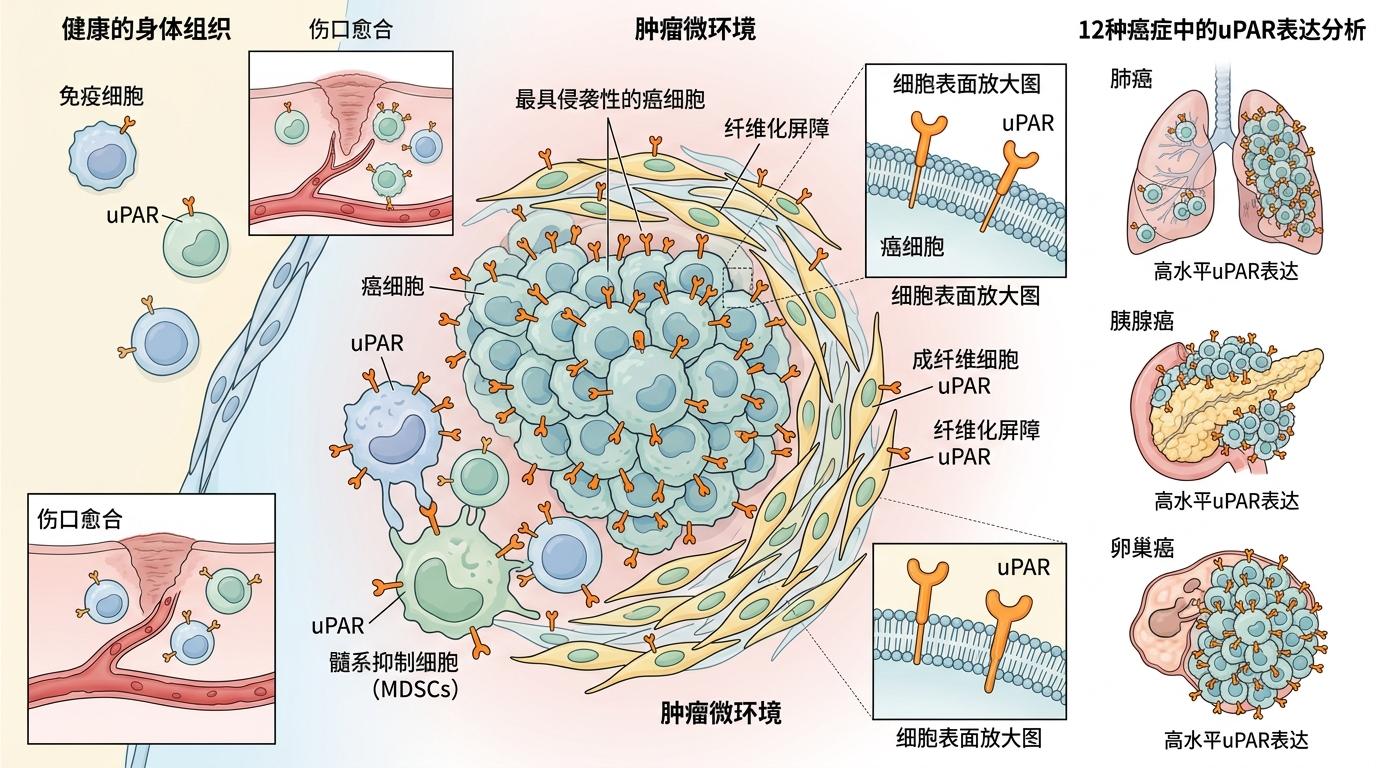 你可以把肿瘤想象成一个伪装成伤口的"非法工地"——正常伤口愈合时,人体会调动细胞修复组织,而肿瘤却劫持了这套程序,让周围的细胞都变成它的帮凶。uPAR,也就是尿激酶纤溶酶原激活物受体,就是这个非法工地的"通用工牌"。