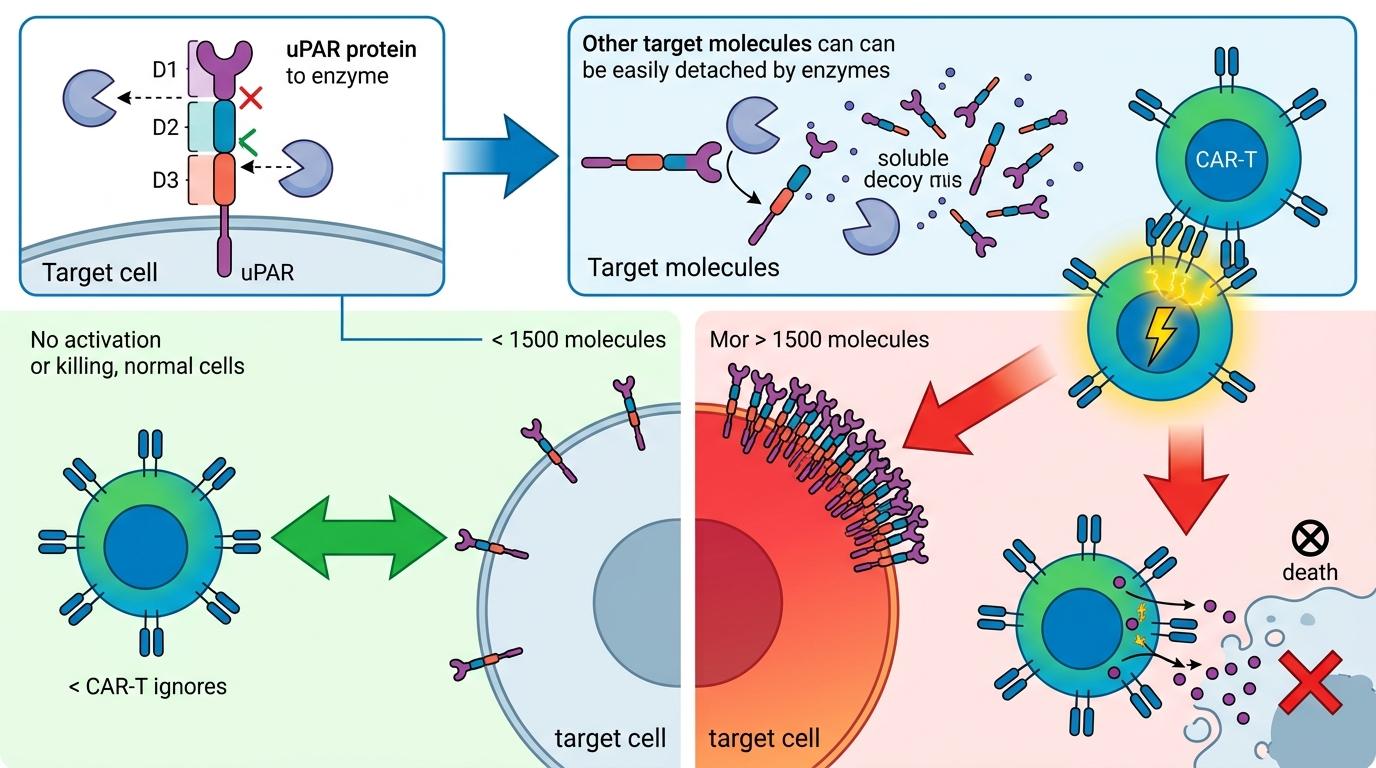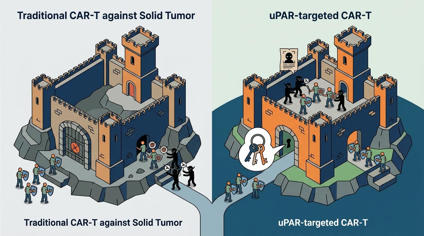 更关键的是,uPAR不是某一类细胞的专属标记,而是肿瘤"恶性状态"的标志——只要细胞在为肿瘤干活,不管是癌细胞还是帮凶,都会带上这个标记。这就给了CAR-T一个精准打击整个肿瘤生态系统的机会,而不是像以前那样,只能盯着单一类型的癌细胞打。