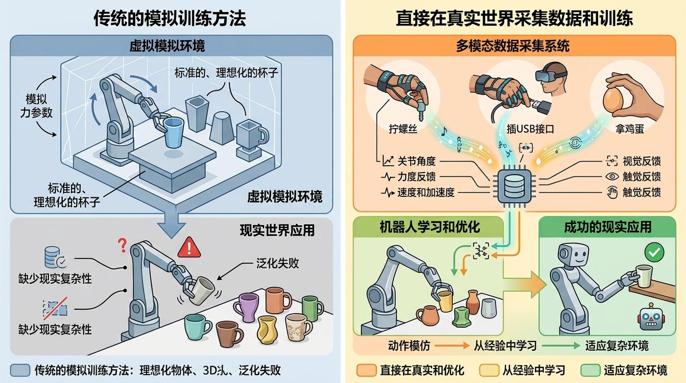 过去,机器人的操作技能大多在模拟环境里训练,就像在游戏里练开车,到了真实世界还是会翻车——模拟场景里的杯子永远是标准形状,而现实中的杯子可能沾了水、放歪了位置。这家企业的做法是直接在真实世界采集数据:他们搭建了一套多模态采集系统,让人类操作员用灵巧手完成拧螺丝、插USB、拿鸡蛋等动作,同时记录下每一个关节的角度、力度、速度,还有视觉、触觉的反馈。