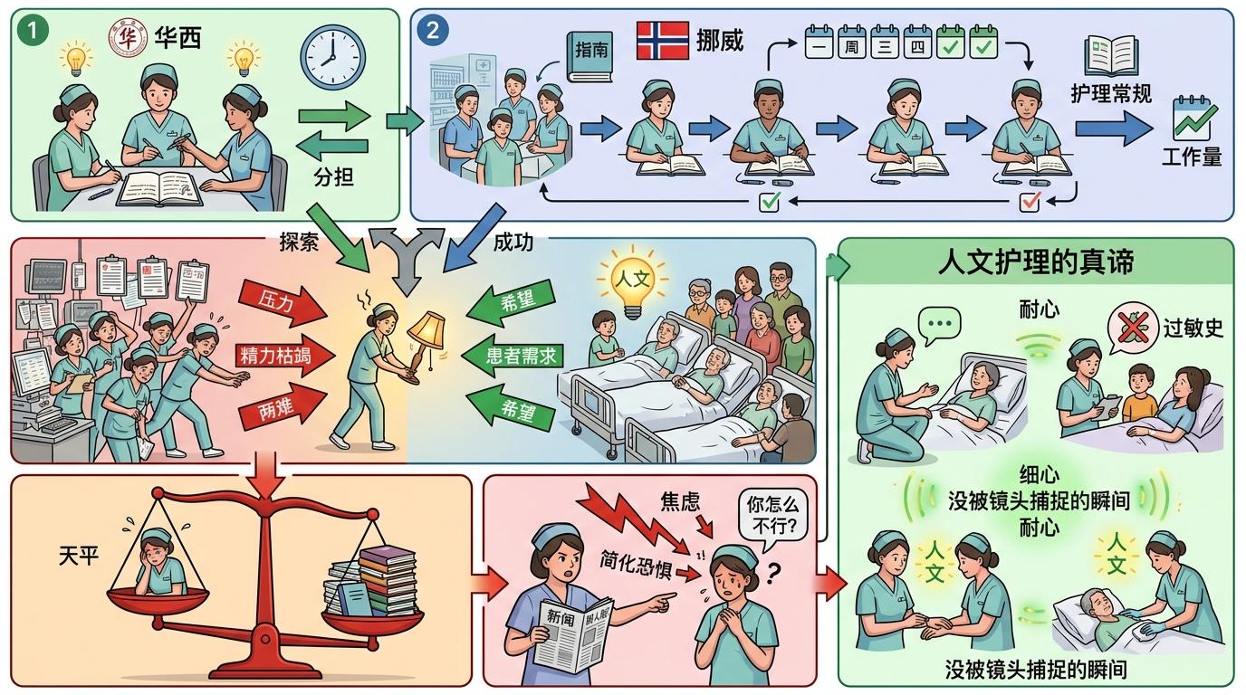 其实早有医院在探索破局的办法。华西医院的8人“日记暖心”小组,用轮值书写分担压力;挪威的国家指南里,明确把日记纳入ICU常规护理,甚至计入工作量。但更多时候,我们看到的是两难:患者需要这束光,护士却连点灯的力气都快耗尽了。有人担心,以后护士长会拿着新闻说“人家都能写,你怎么不行”——这种焦虑里,藏着对“人文护理被简化”的恐惧:人文从来不是写几篇日记,而是蹲下来和患者说话的耐心,是记住家属过敏史的细心,是那些没被镜头捕捉到的、琐碎却重要的瞬间。