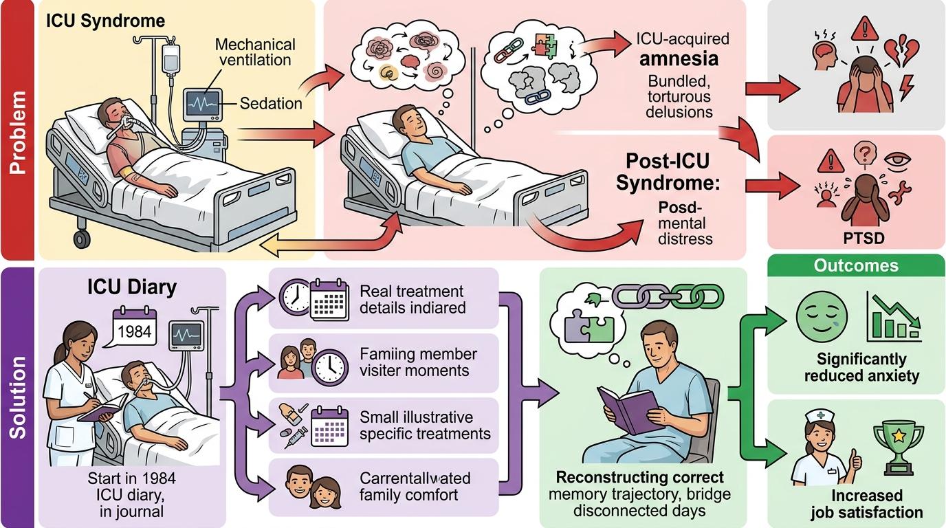 这不是某个人的“暖心之举”,而是一场早有科学依据的人文实验。1984年丹麦护士最先拿起笔,为ICU患者记录那些他们“断片”的日子——重症监护室里的镇静剂、机械通气会像橡皮擦,抹去患者的连贯记忆,留下的只有被捆绑、被折磨的妄想,这就是“ICU后综合征”,患者出院后常被创伤后应激障碍(PTSD)缠上。而ICU日记就像一张精准的拼图,用真实的治疗细节、家属的探视瞬间,帮患者重建正确的记忆轨迹。2025年的一项研究更直接:用了结构化叙事护理日志的患者,焦虑水平显著下降,护士的职业成就感也跟着提了上来。