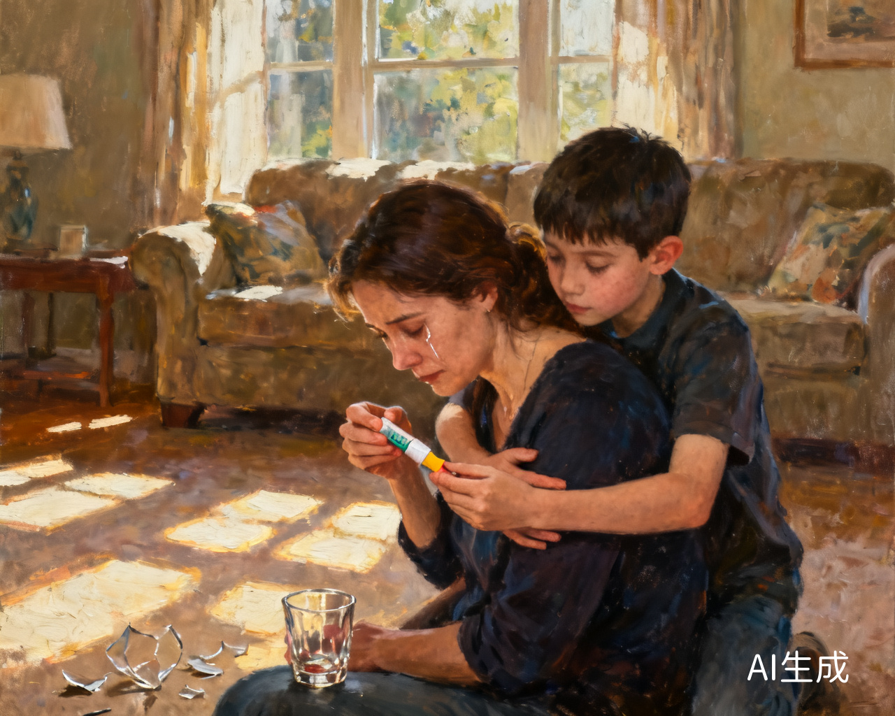 “哐当!”清脆的破碎声响起,像一根引线,瞬间点燃了Kym积压的所有情绪。她靠着厨房水槽,崩溃大哭,泣不成声。