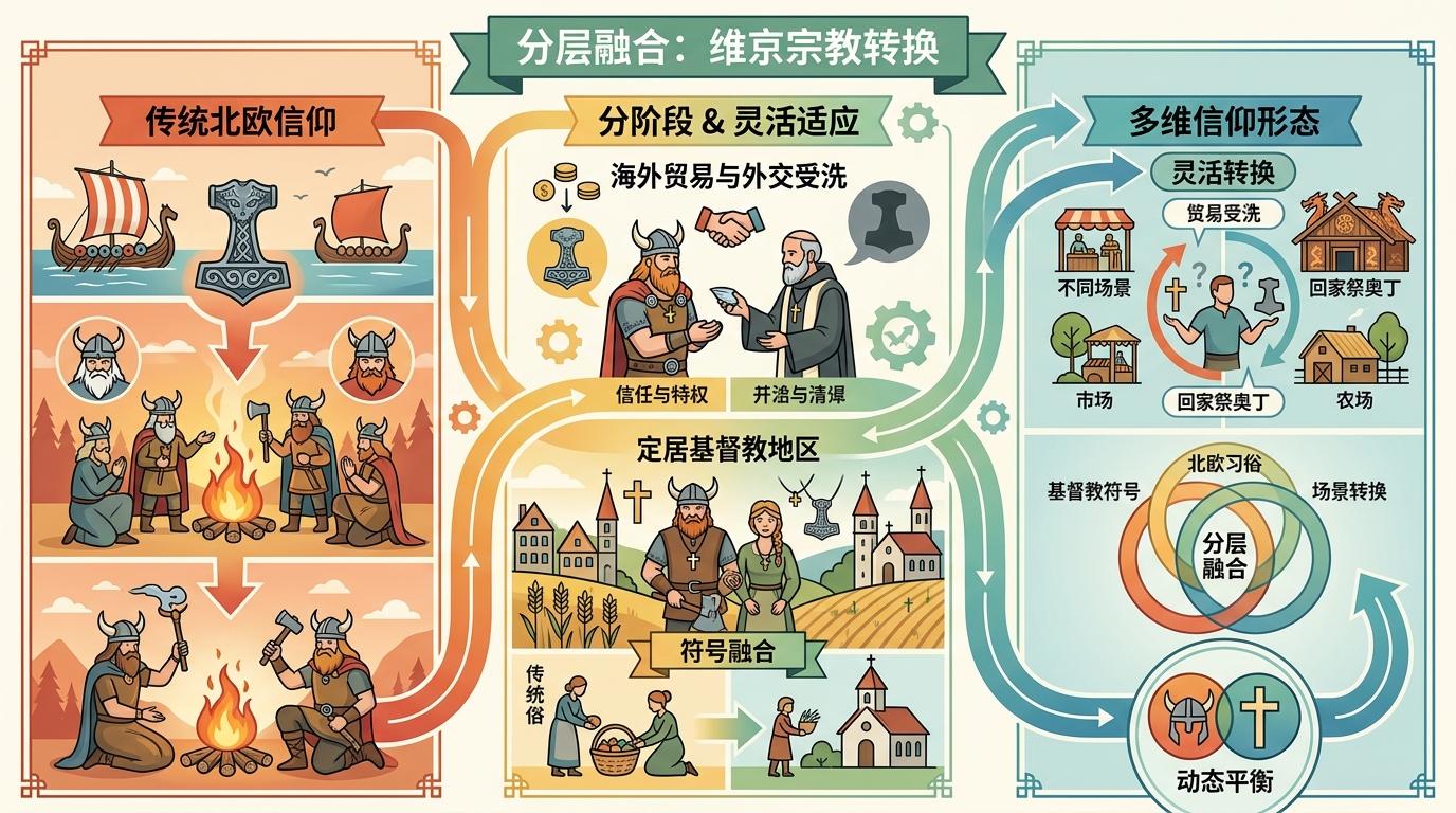 学界如今提出了「分层融合」的概念:维京人的宗教转换从来不是非黑即白的「异教徒变基督徒」,而是分阶段、分场景的灵活适应。部分维京人在海外贸易或外交中受洗,只是为了获得基督教社群的信任与特权,回到家乡后依旧祭拜奥丁、托尔;有些则在定居基督教地区后,逐渐接受了当地的信仰符号,却保留着北欧神话的传统习俗。