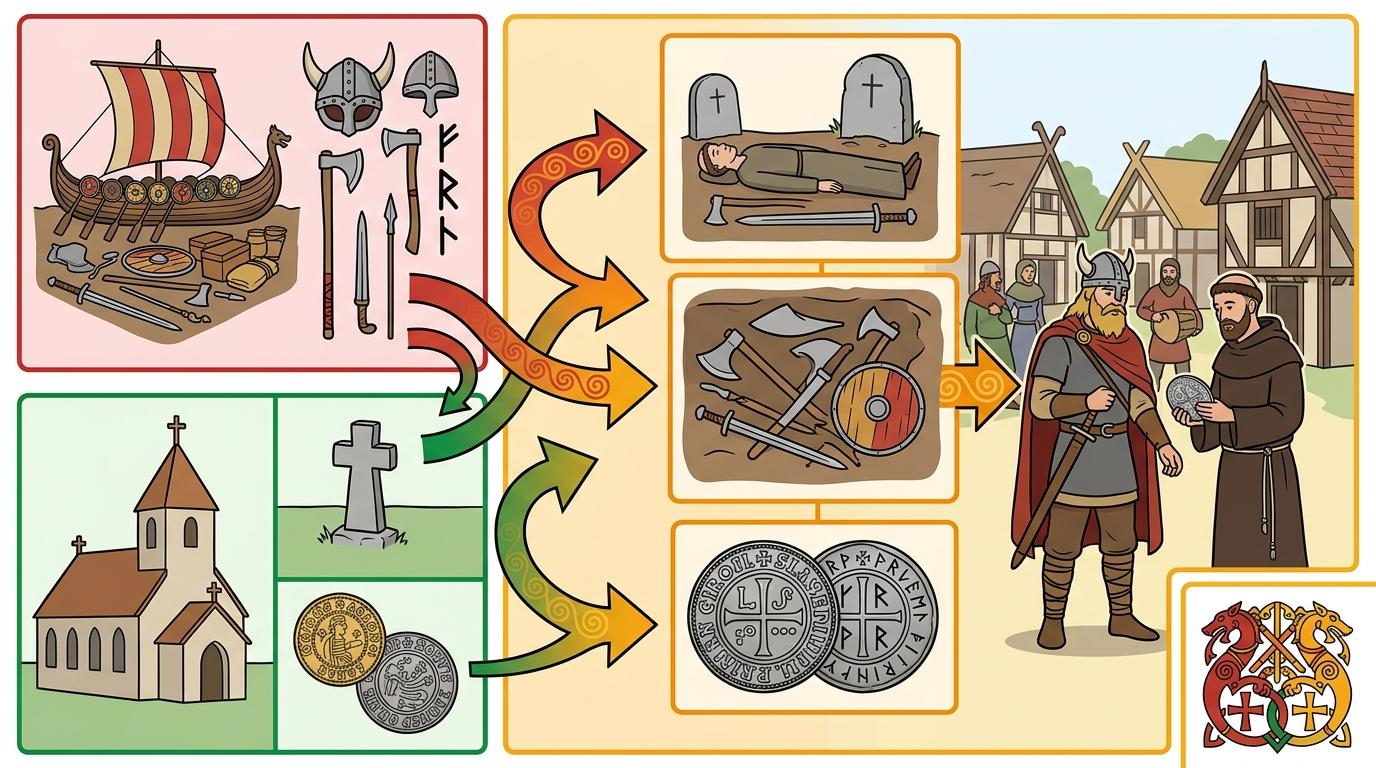 这种共生关系在「丹麦法区」的考古发现里随处可见:维京人的墓葬采用基督教的埋葬方式,却陪葬着北欧风格的武器;盎格鲁-撒克逊人的货币上,开始出现维京符文的痕迹。9世纪的英格兰不是被「分割」成基督教和异教两个世界,而是形成了一个模糊的中间地带,不同的文化、信仰在这里碰撞、妥协、融合。