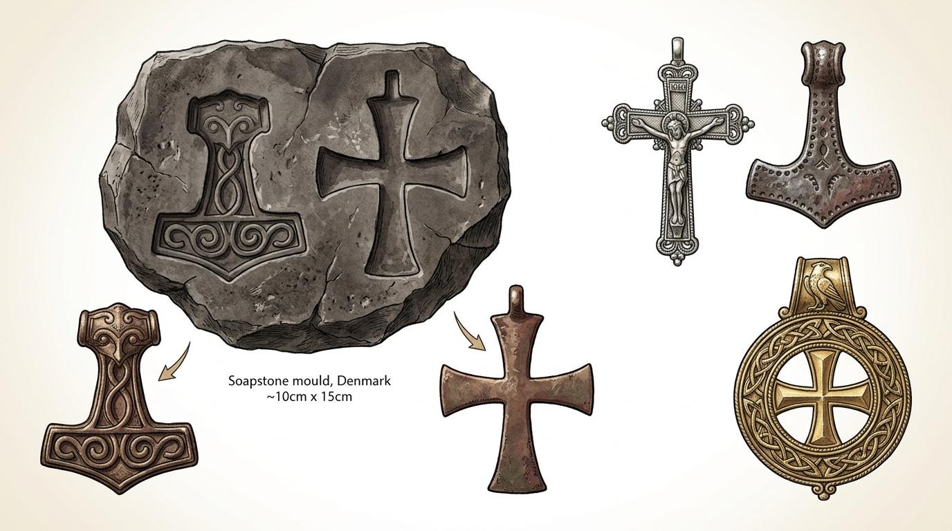 丹麦出土的肥皂石模具,能同时制作托尔之锤和基督教十字架吊坠;维京墓葬里,女性佩戴银十字架,棺材外却钉着托尔之锤铁饰——这些都是「双重信仰」的直接证据。他们不是在两种宗教里选边站,而是把不同的宗教符号当作工具:十字架用来融入当地社会,托尔之锤用来祈求战斗中的保护。这枚圣约翰挂坠,很可能就是这种「实用主义信仰」的产物:要么是维京征服者用来安抚基督教臣民的身份符号,要么是皈依的维京人用来平衡新旧信仰的护身符。