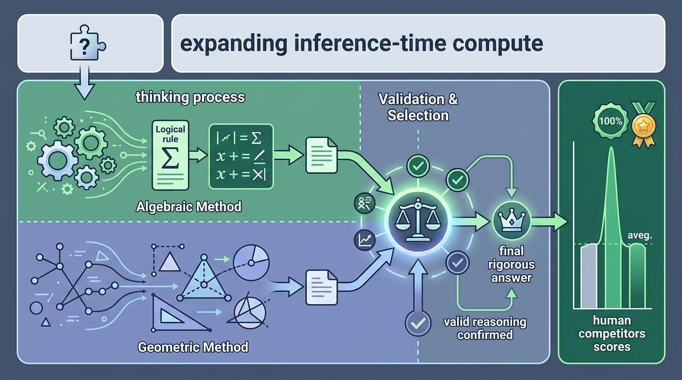 更关键的是「推理时算力扩展」:它会同时生成多条推理路径,比如用代数法和几何法分别解题,再通过内部验证机制筛选出最严谨的答案。这种多路径验证,让它在日语数学奥赛中拿到了满分,甚至超过了当届人类选手的平均水平。