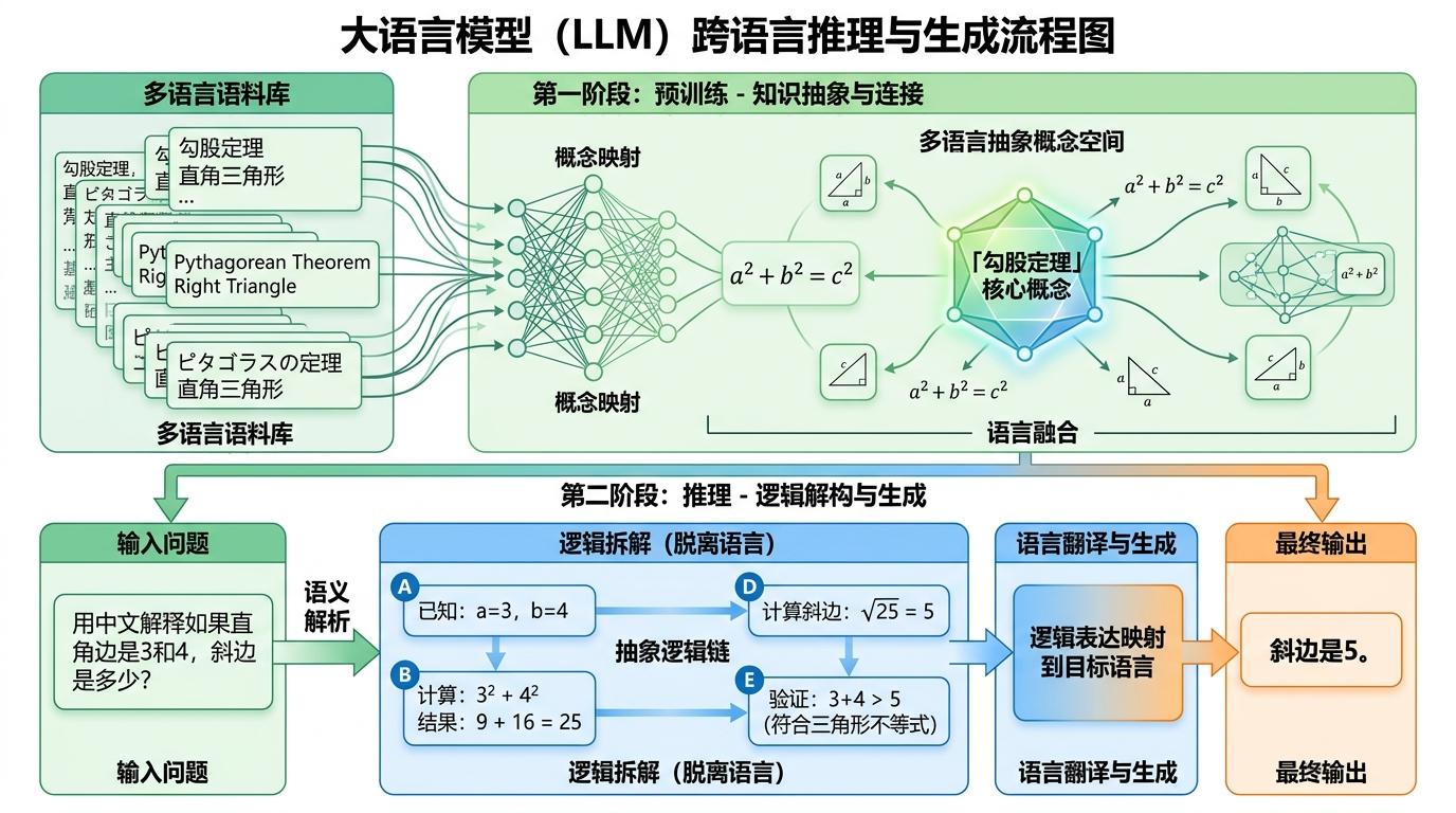 真实的机制要复杂得多:首先,AI需要在预训练阶段通过百万级多语言语料,搭建一个「抽象概念空间」——比如不管是中文的「勾股定理」、英文的「Pythagorean theorem」还是日语的「ピタゴラスの定理」,在这个空间里都是同一个节点。然后在推理阶段,它会先把问题拆解成脱离语言的逻辑步骤,比如「先确定直角边长度→代入平方和公式→验证结果是否符合三角形不等式」,最后再把这个逻辑链翻译成目标语言。