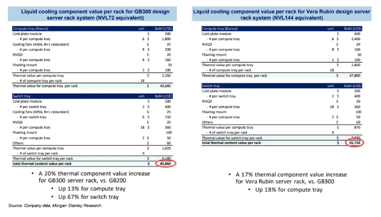 英伟达的GB300平台,其TDP突破1400W,这被视为一个分水岭,液冷自此成为标准配置。这直接引爆了散热产业链的价值。数据显示,一个GB300(NVL72)机柜的散热组件总价值已高达约5万美元。而到了下一代Vera Rubin平台,由于热量密度进一步提升,单机柜的散热组件总价值将增长至近5.6万美元,其中为高速交换机托盘设计的散热模组价值增幅更是高达67%。