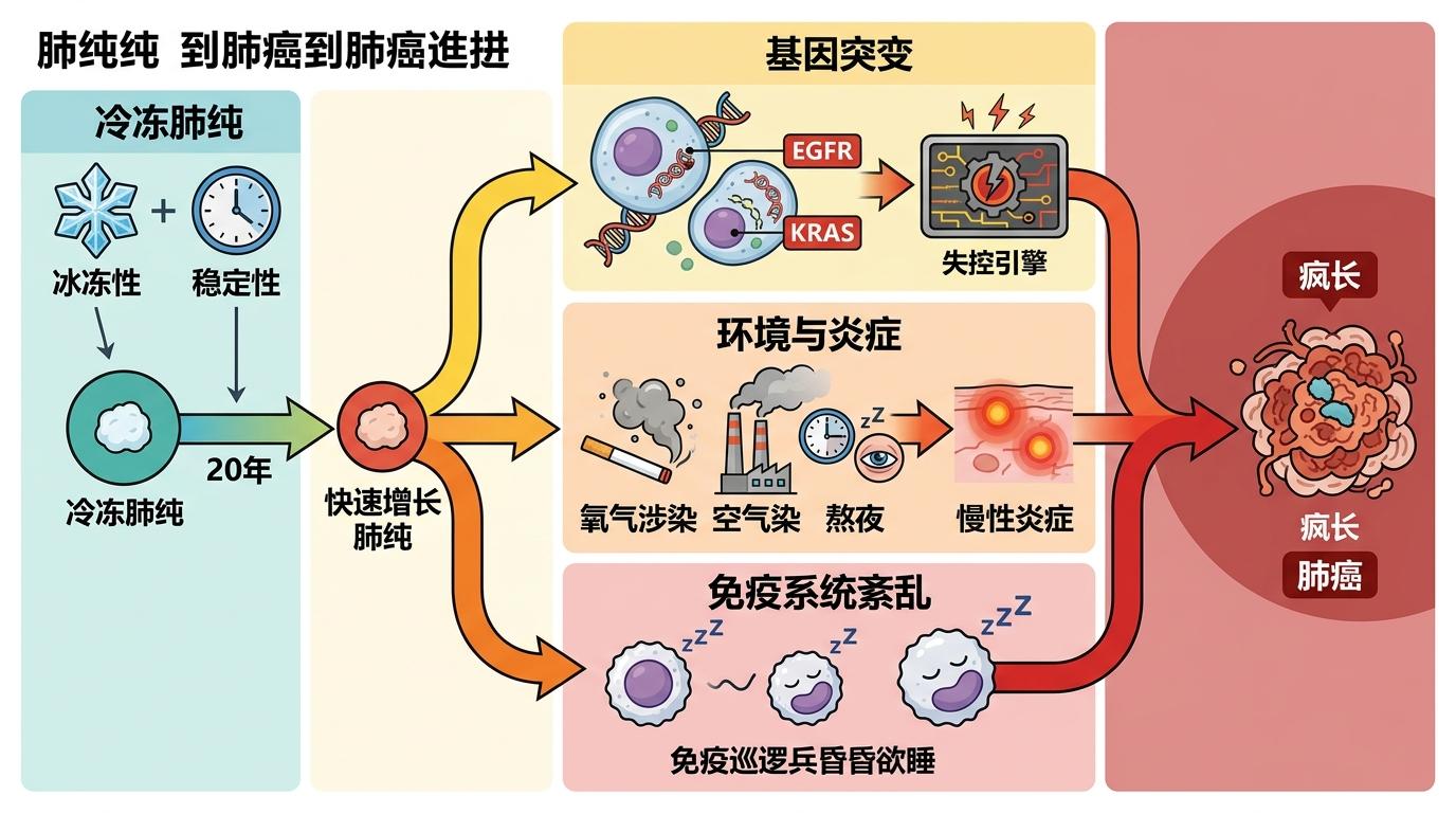 从结节到肺癌的路,不是一条笔直的下坡。有的结节会像被冻住的水,几年甚至十几年都保持原样;有的却像被浇了汽油的火苗,在短短几个月里疯长。这背后是基因、环境和免疫的三重博弈:EGFR或KRAS基因的突变会给细胞安上失控的引擎,吸烟、熬夜、空气污染带来的慢性炎症会不断给引擎加油,而长期紊乱的作息早已让免疫系统的巡逻兵昏昏欲睡。