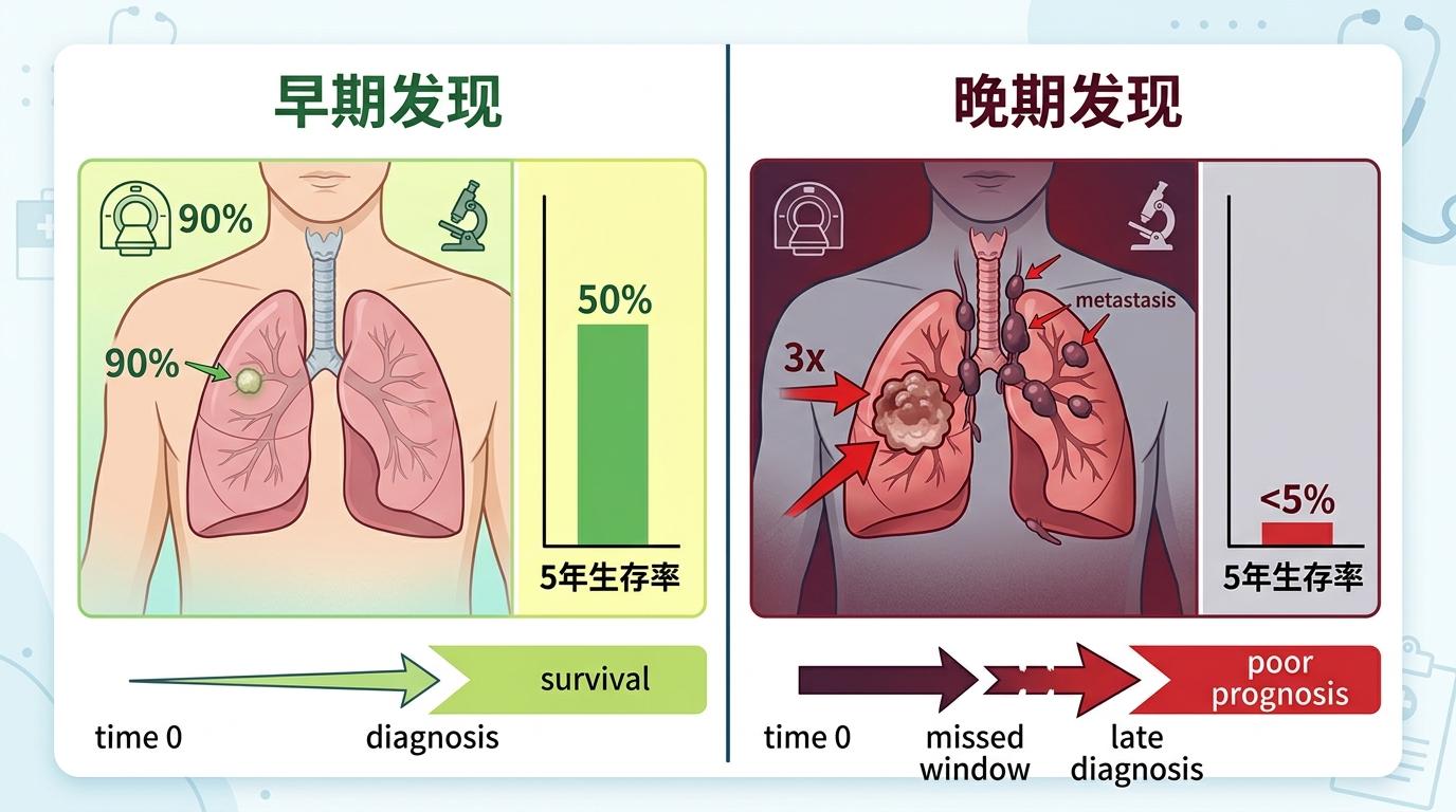 当李女士再次躺在体检床上时,那个曾经不起眼的小结节已经长大了三倍,淋巴结里也出现了转移的癌细胞。晚期肺癌的诊断书像块冰,砸得她连后悔的力气都快没有了。她不知道的是,低剂量螺旋CT的筛查敏感度能达到90%以上,早发现的早期肺癌患者5年生存率能超过50%,而晚期患者的这个数字不足5%。