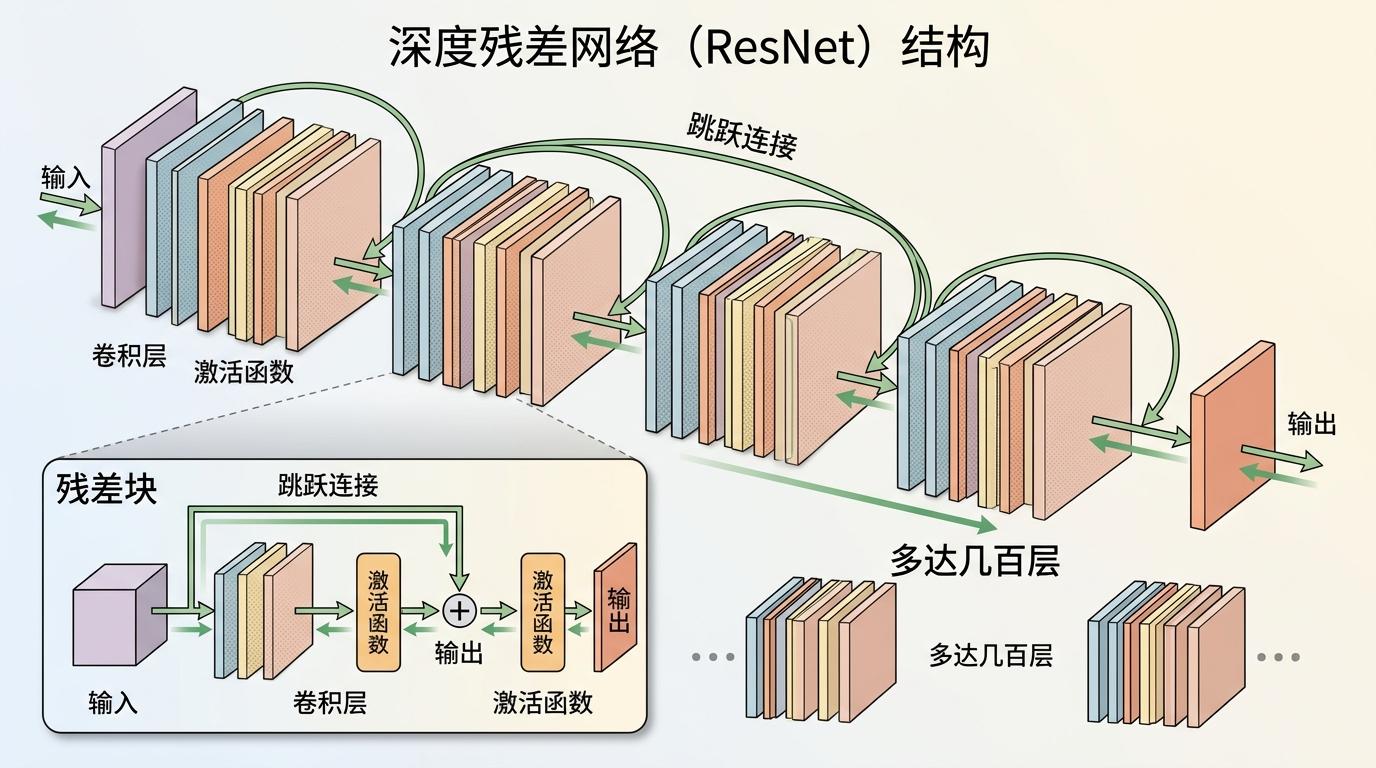 2015年残差网络(ResNet)的出现,给梯度开了个“绿色通道”:它不直接学输入到输出的完整映射,而是学输入和输出的“残差”——就像你不用记住整本书,只需要记住和上一版的区别。恒等映射的跳跃连接让梯度能直接从输出层传到输入层,彻底解决了梯度消失的问题。现在,几百层的神经网络能像搭积木一样轻松训练。