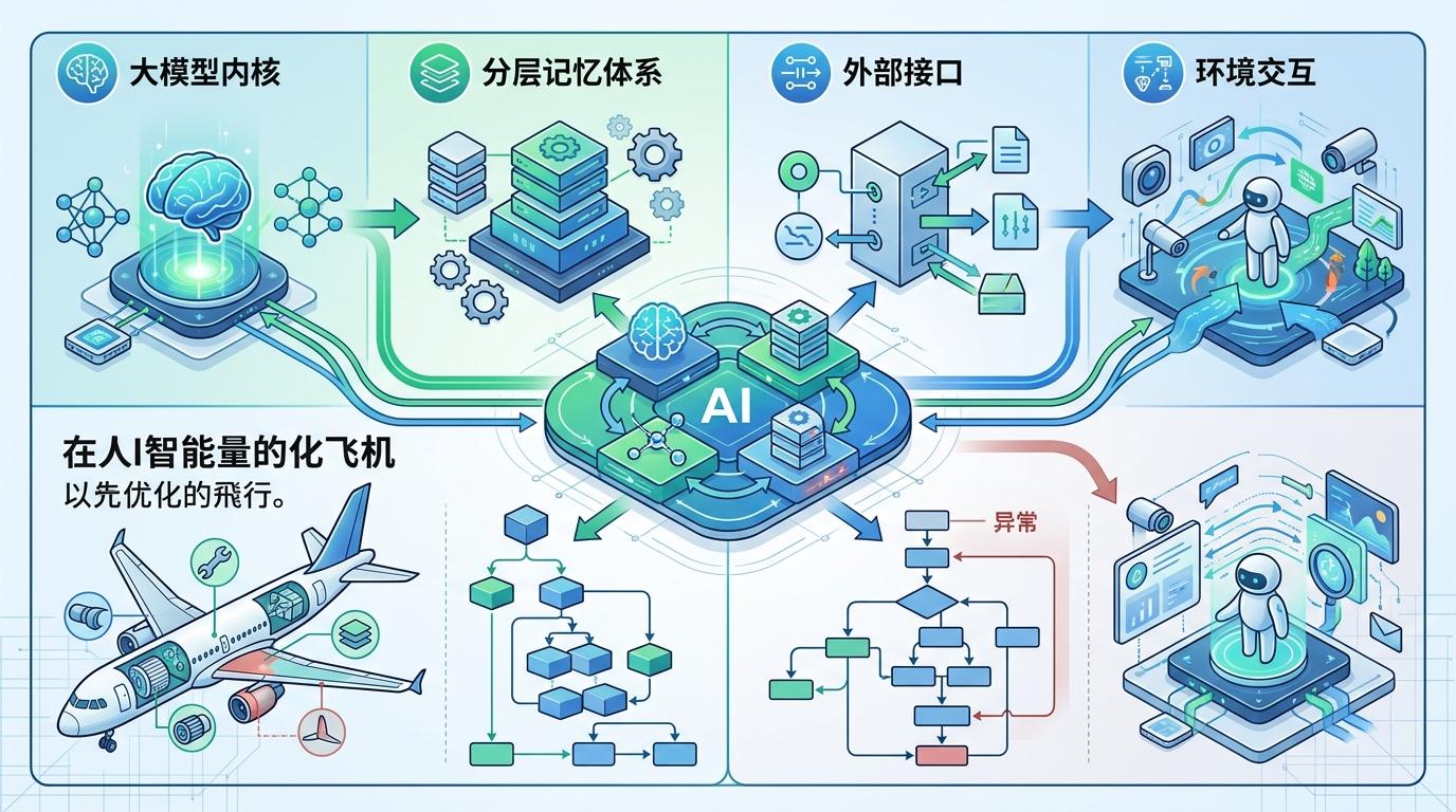 当单个算法的理论基础逐渐清晰,科学家开始把AI当成一个复杂系统来看待。就像一架飞机,不能只优化发动机,还要考虑机翼、尾翼和控制系统的协同。AI系统也一样,它包括大模型内核、分层记忆体系、外部接口和环境交互四个部分。